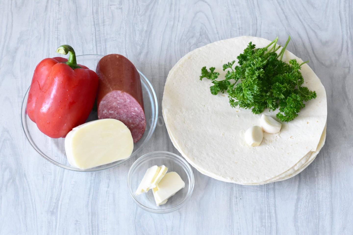 Очень просто и быстро. Для начала подготовьте все необходимые ингредиенты по списку. Копченую колбасу можете заменить на вареную, а также на ветчину, сырокопченое или варенокопченое мясо. Можете заменить или дополнить начинку по своему вкусу. Тортилью можно использовать как покупную, так и домашнюю. Рецепт домашней тортильи можно найти после описания всех шагов.