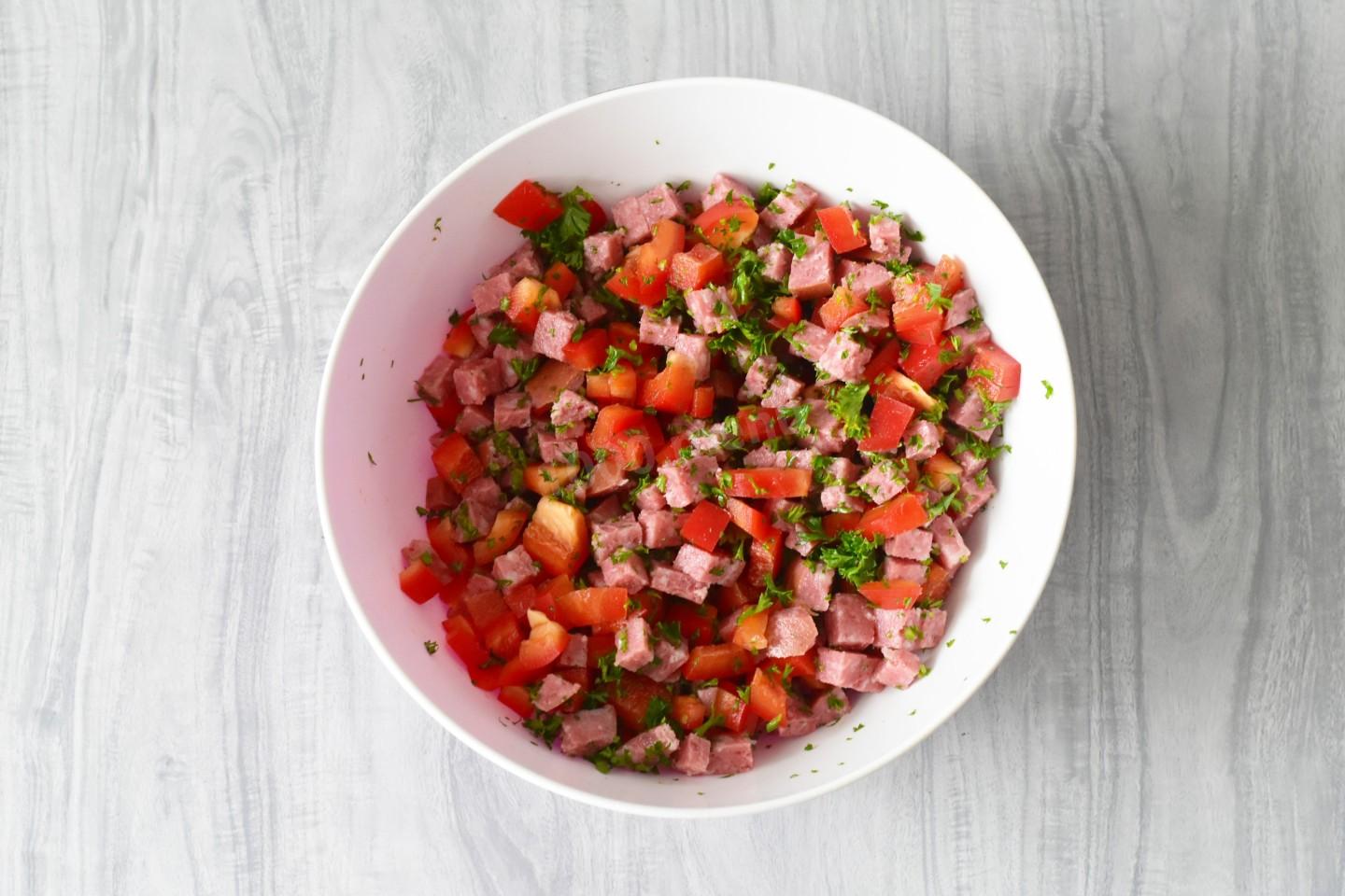 Колбасу очистите и нарежьте мелкими кубиками. Болгарский перец очистите от семян и плодоножки и также нарежьте мелкими кубиками. Моцареллу натрите на крупной терке. Сорт сыра можете подбирать по своему вкусу. Важно, чтобы он был без заменителей молочных жиров, был вкусным и хорошо плавился. Как заменять разные виды сыров читайте по ссылке ниже. Петрушку мелко порубите. В миске соедините колбасу, болгарский перец и зелень и перемешайте.