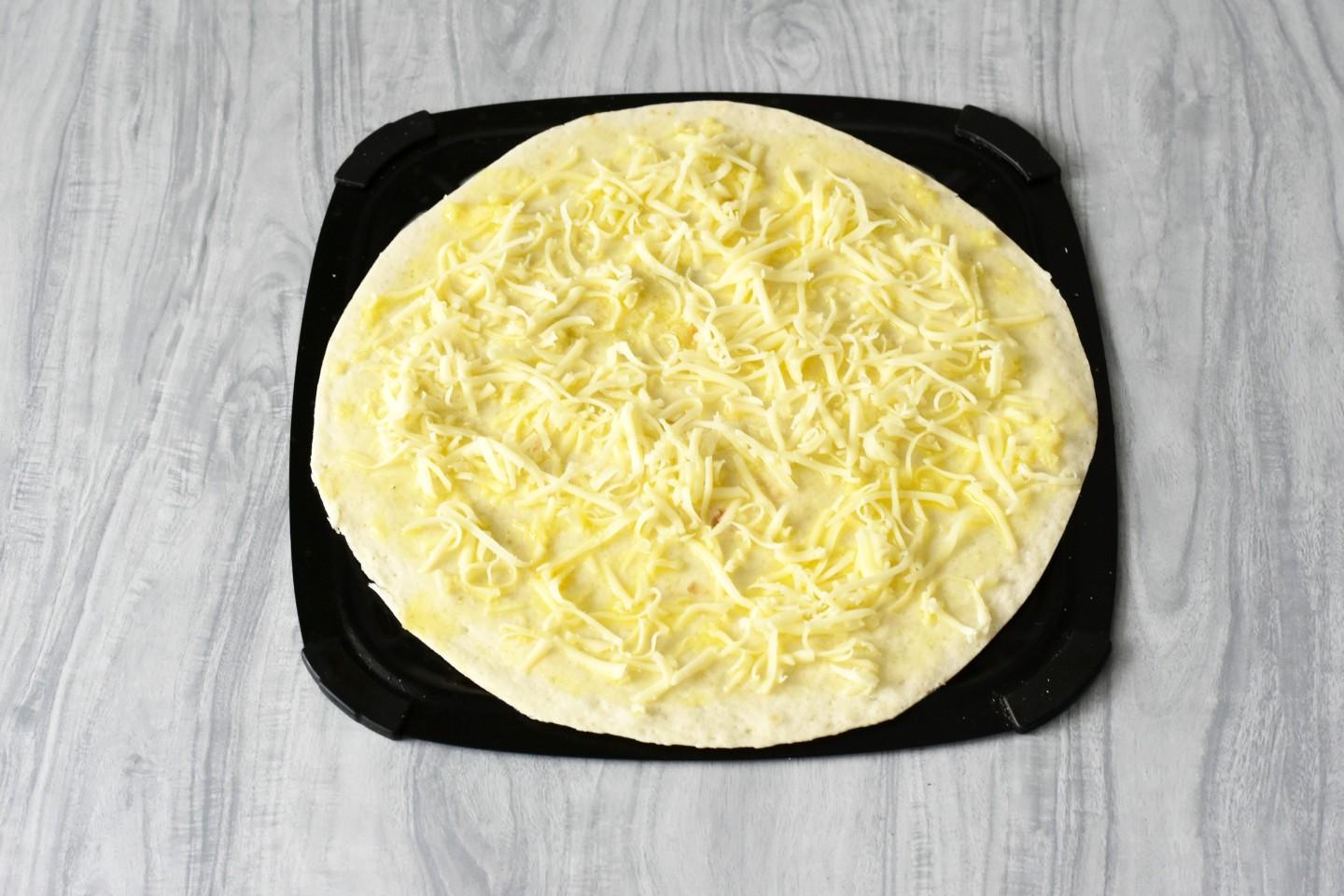 Прежде чем приступать к формовке тортильи, посмотрите, подходит ли размер лепешек под ваш аэрогриль и при необходимости подрежьте края до нужного размера. Тортилью с помощью кисточки смажьте сливочным маслом с чесноком. Сверху равномерно посыпьте частью тертого сыра.