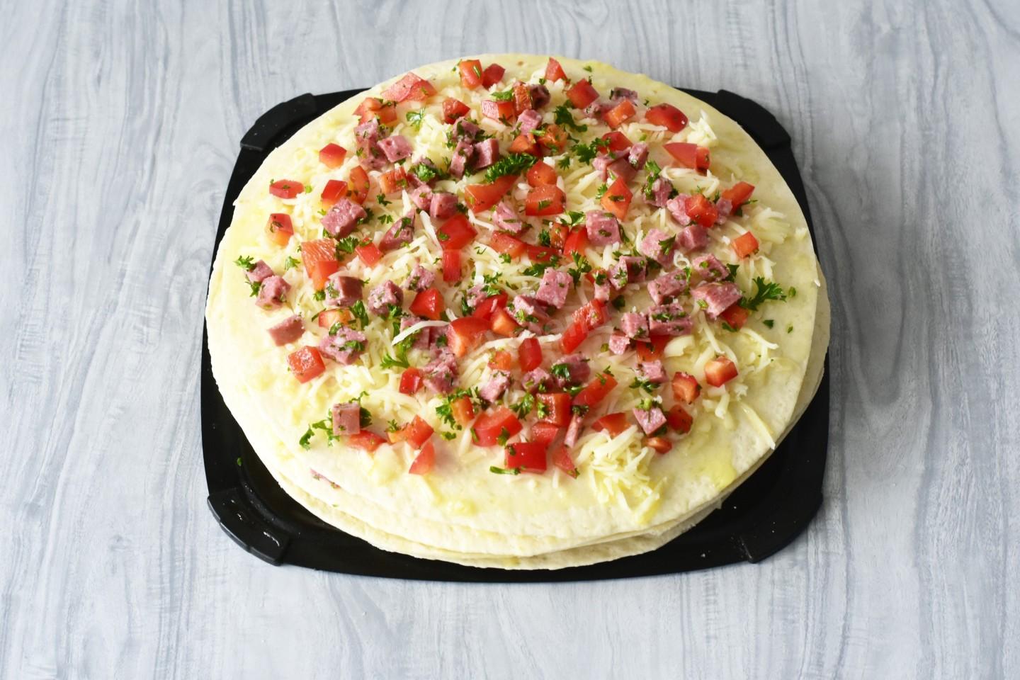 Посыпьте лепешку смесью из колбасы, болгарского перца и зелени. Накройте второй лепешкой и также распределите по ней начинку. Так же поступите с оставшимися лепешками. Переложите тортилью в чашу аэрогриля на решетку.