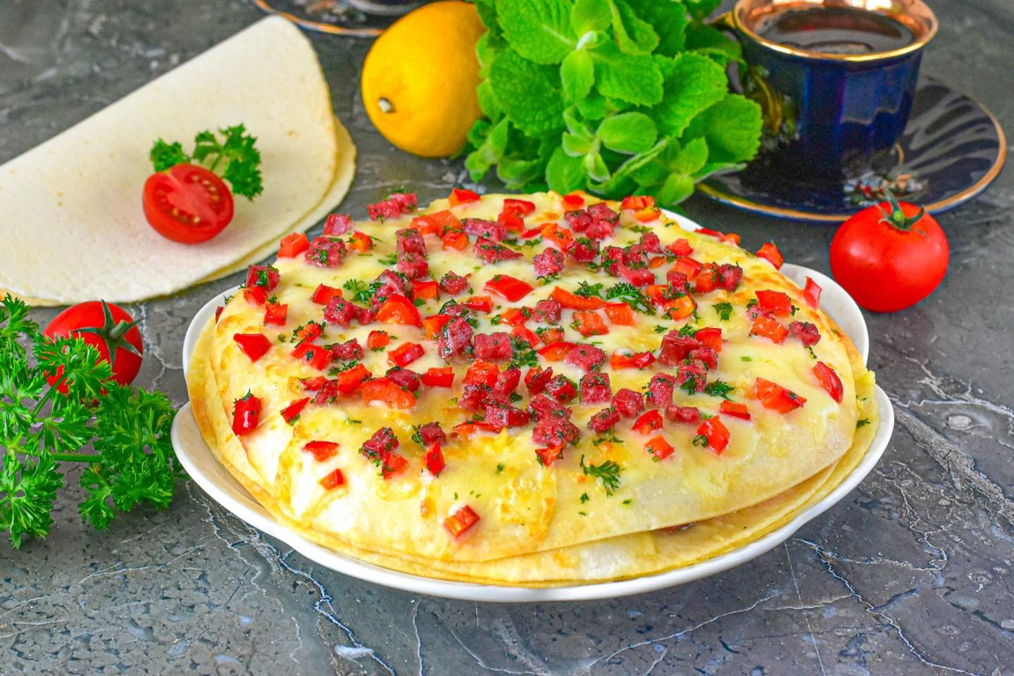 Более легкий вариант: заменить колбасу на отварную куриную грудку, использовать легкий сыр и смазывать лепешку оливковым маслом.
