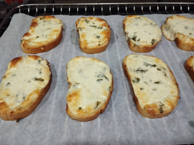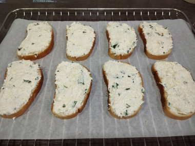 Хлеб (если у вас не нарезанный) разрежьте на ломтики толщиной примерно 1 см и выложите на пергамент. На каждый ломтик хлеба равномерно нанесите начинку. Противень застелите пергаментной бумагой, выложите на него будущие гренки и отправьте в разогретую духовку.