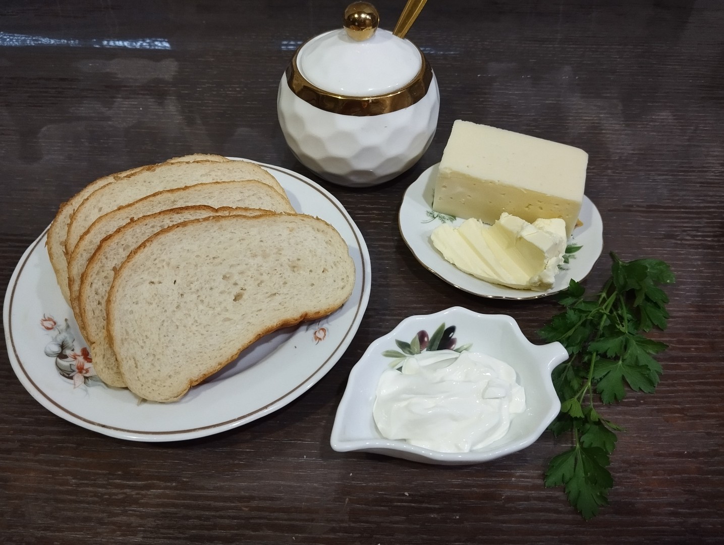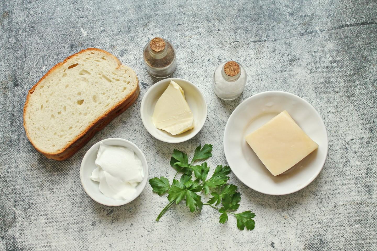 Подготовьте все необходимые ингредиенты для приготовления. Сливочное масло достаньте заранее, чтобы стало мягким. Белый хлеб легче режется, когда он не свежеиспеченный. Также можно использовать уже нарезанный. Зелень сполосните и обсушите. Включите духовку разогреваться до 180 градусов.