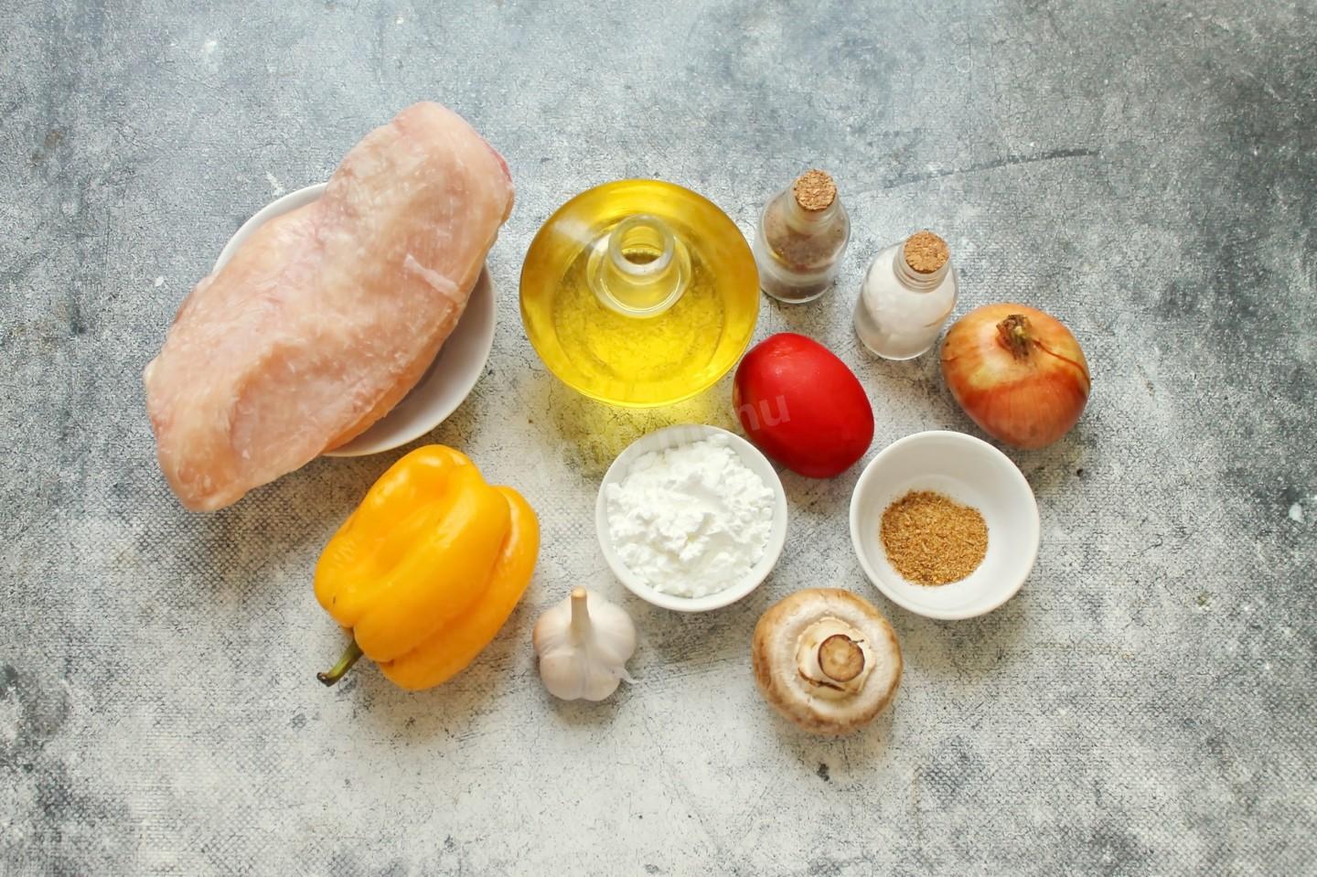 Подготовьте все необходимые ингредиенты для приготовления. У куриной грудки удалите кожу, сполосните и обсушите бумажным полотенцем. Овощи вымойте и почистите при необходимости. Шампиньоны протрите сырой салфеткой, срежьте места загрязнения. Включите духовку разогреваться до 180 градусов.