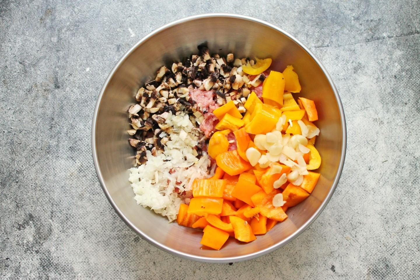 Грудку порежьте на кусочки и пропустите через мясорубку с крупными ячейками. Положите фарш в миску и добавьте специи и поперчите. Шампиньоны нарежьте мелким кубиком, болгарский перец разрежьте на куски среднего размера. Чеснок порежьте тонкими пластинками, репчатый лук натрите на крупной терке или измельчите в мясорубке. Положите грибы и овощи в фарш, перемешайте. В миску с фаршем грибами и овощами добавьте крахмал, посолите, перемешайте и хорошо отбейте.