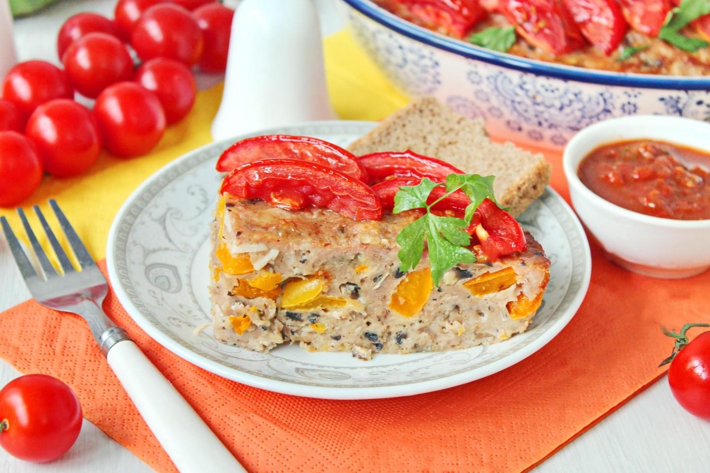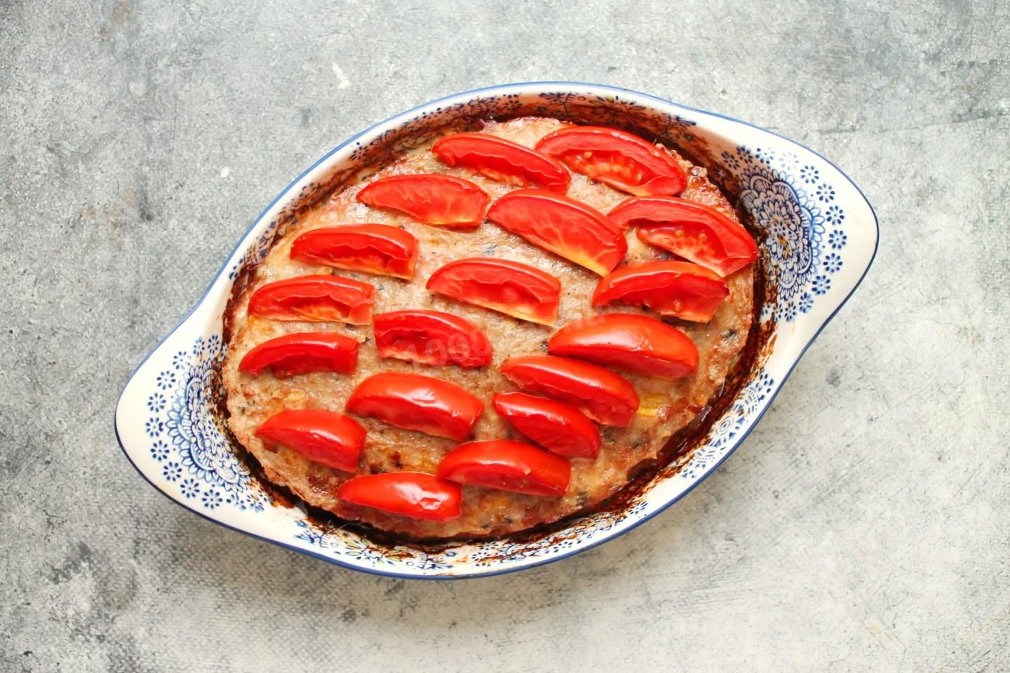 Для этого соберите фарш в руку, поднимите над миской и киньте обратно. Сделайте так 10-15 раз до плотного состояния. Форму для запекания смажьте растительным маслом, положите фарш и разровняйте, немного прижимая. С выбором формы для запекания поможет статья по ссылке в конце рецепта. Поставьте форму в духовку и запекайте при 180 градусах в течение 20 минут. Помидор порежьте на дольки и разложите сверху запеканки, немного посолите.