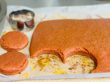 Выпекайте бисквит в разогретой до 180℃ духовке 15-20 минут до готовности. Точное время зависит от вашей духовки. Следите, чтобы корж не пересушился и не подгорел снизу. Узнать о видах пергамента и об особенностях работы духовок можно, прочитав отдельные статьи, ссылки в конце рецепта. Бисквит охладите на решетке.Шаг 7. Как и сколько вырезать заготовок для пирожных и теста?