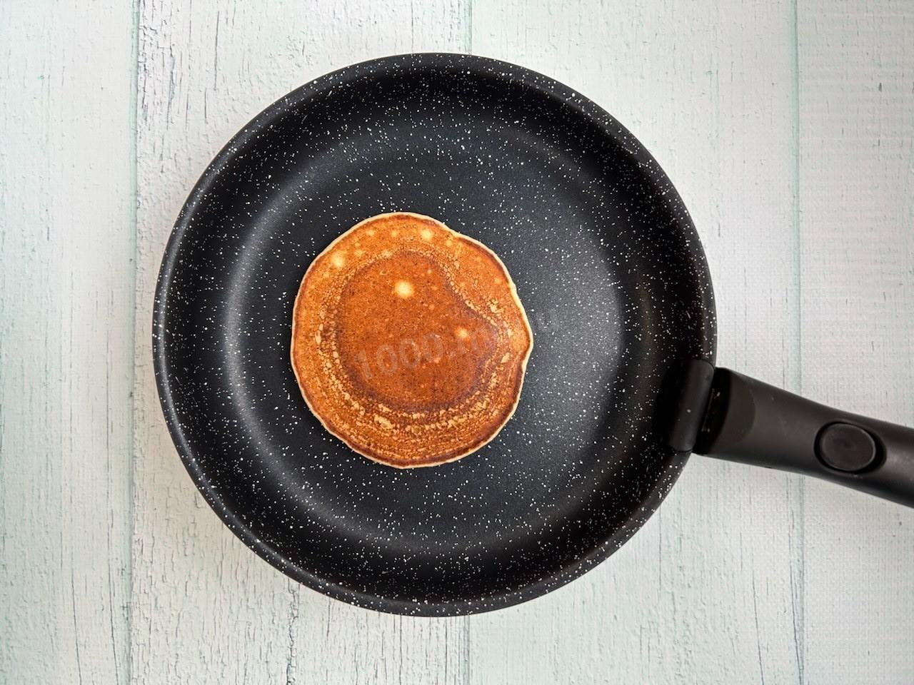 Поставьте сковороду на средний огонь и хорошо разогрейте. Жарятся панкейки без масла. Выкладывайте по 2–3 ст. л. теста на сковороду, формируя круглые панкейки. Жарьте 2-3 минуты до появления пузырьков на поверхности. Затем переверните и готовьте ещё 1–2 мин до золотистой корочки. Точное время приготовления будет зависеть от размера панкейков, особенностей работы вашей плиты и выбранной сковороды. О сковородках подробнее читайте в конце рецепта.