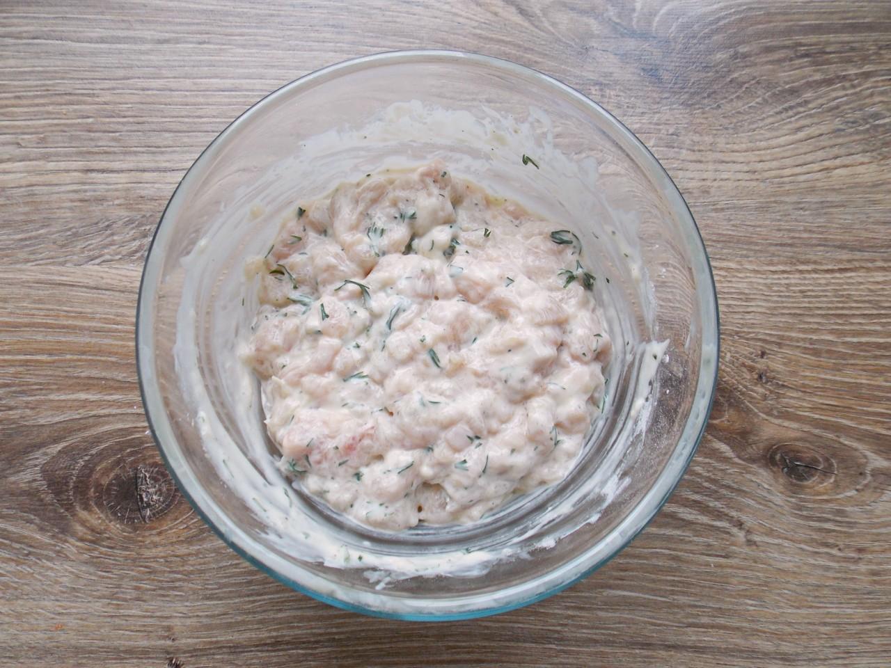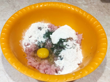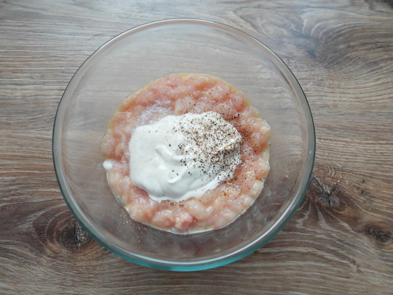 В миску с филе и яйцом и добавьте сметану, посолите и поперчите. Сметана должна быть только натуральная, высокой жирности, иначе котлеты получатся студенистыми. Если не любите сметану или нельзя молочные продукты, замените ее обычным майонезом в той же пропорции. Но уменьшите в последствие количество соли, ведь она уже есть в этом продукте. Хорошенько перемешайте.