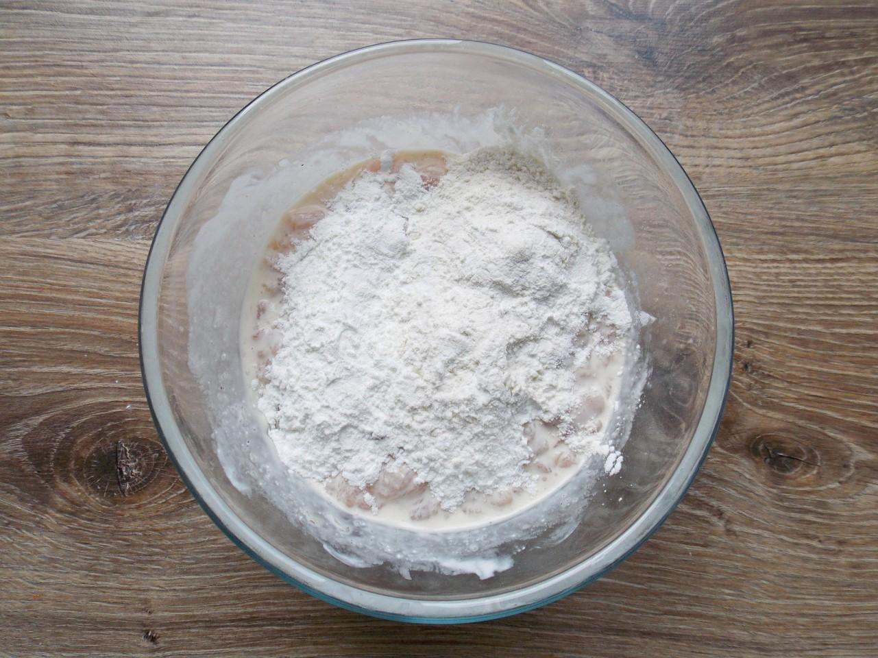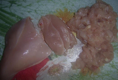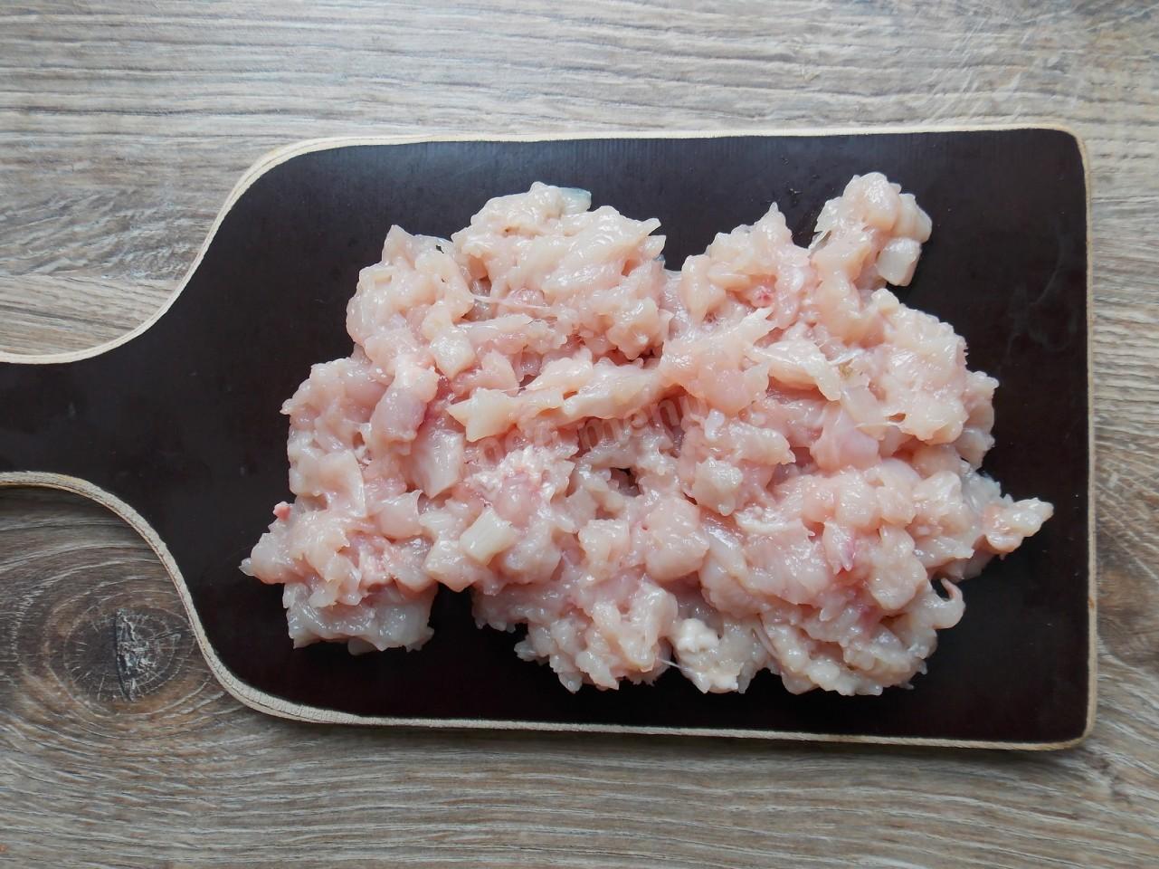 Куриное филе вымойте, обсушите и мелко порежьте острым ножом. Филе можно взять любое по вашему вкусу, но лучше всего сюда подойдет куриная грудка. Ее легче всего нарезать мелкими кусочками, она не имеет прожилок и готовится намного быстрее. Грудка, приготовленная таким способом не будет сухой, а останется сочной, за счет обволакивания каждого кусочка. Ну а если совсем лениво, можно пропустить грудку через мясорубку с решеткой с самыми большими отверстиями.
