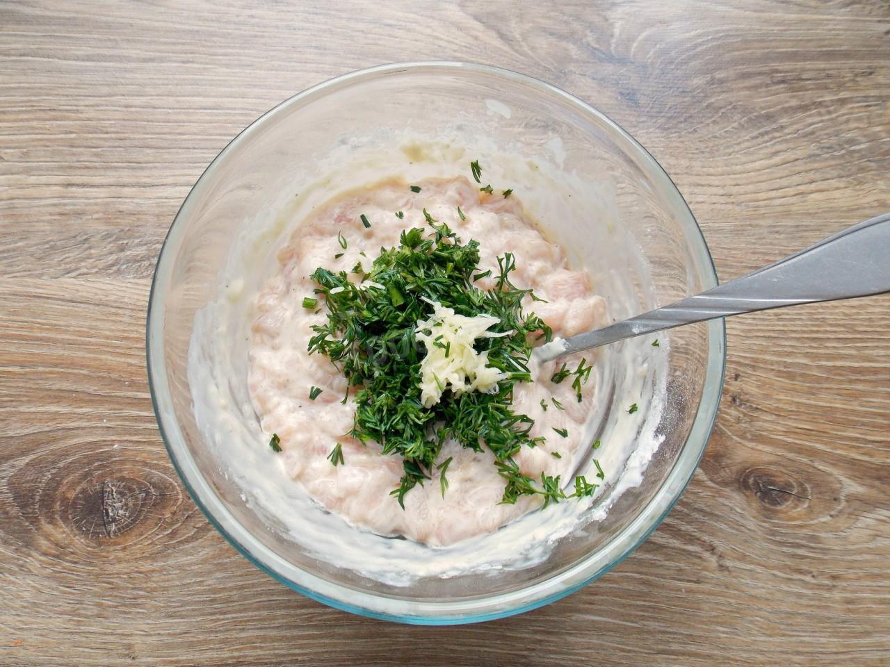 Укроп вымойте и обсушите, мелко порежьте. Чеснок очистите, и натрите на мелкой терке, добавьте все в миску с фаршем.