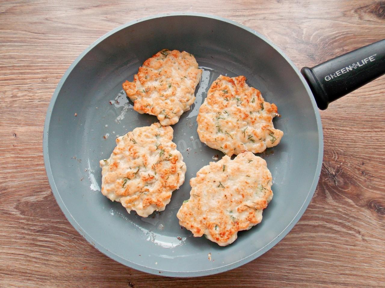 В сковороду налейте растительное масло и разогрейте. Ложкой положите фарш, сформировав круглые котлетки. Закройте крышкой и готовьте в течение 7 минут на медленном огне до золотистой корочки. Откройте крышку и переверните котлеты. Готовьте еще в течение 5-7 минут, до готовности.