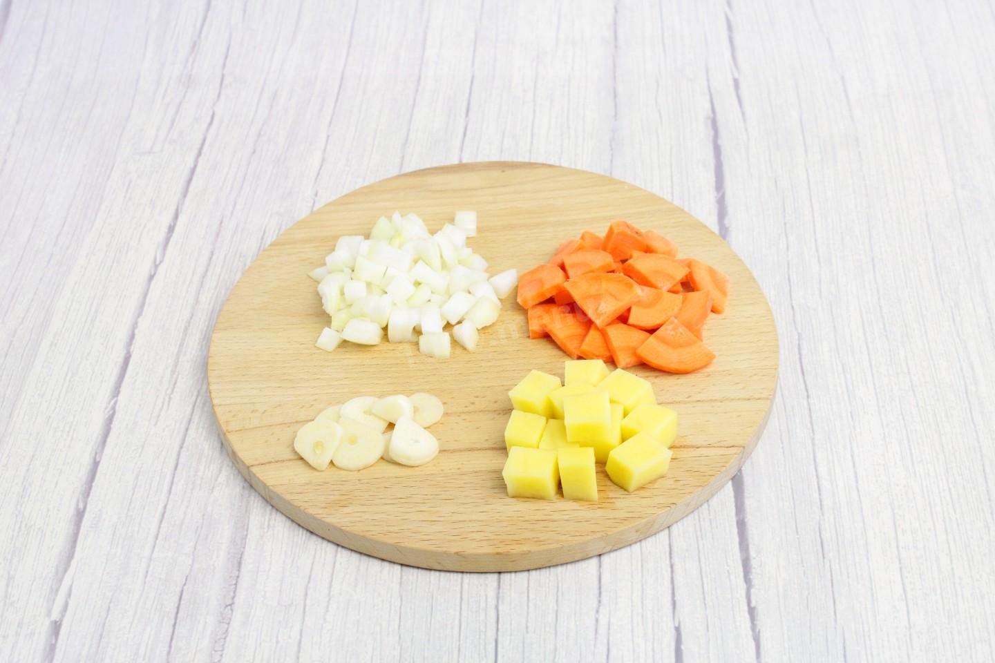 Нарежьте картофель небольшими кубиками. Морковь нарежьте полукружочками, кружочками или небольшими брусочками, лук - маленькими кубиками. Чеснок можно нарезать тонкими пластинками. Форма измельчения овощей особого значения не имеет. Размер будет влиять только на время приготовления. Чем крупнее нарезка, тем дольше будут вариться овощи.