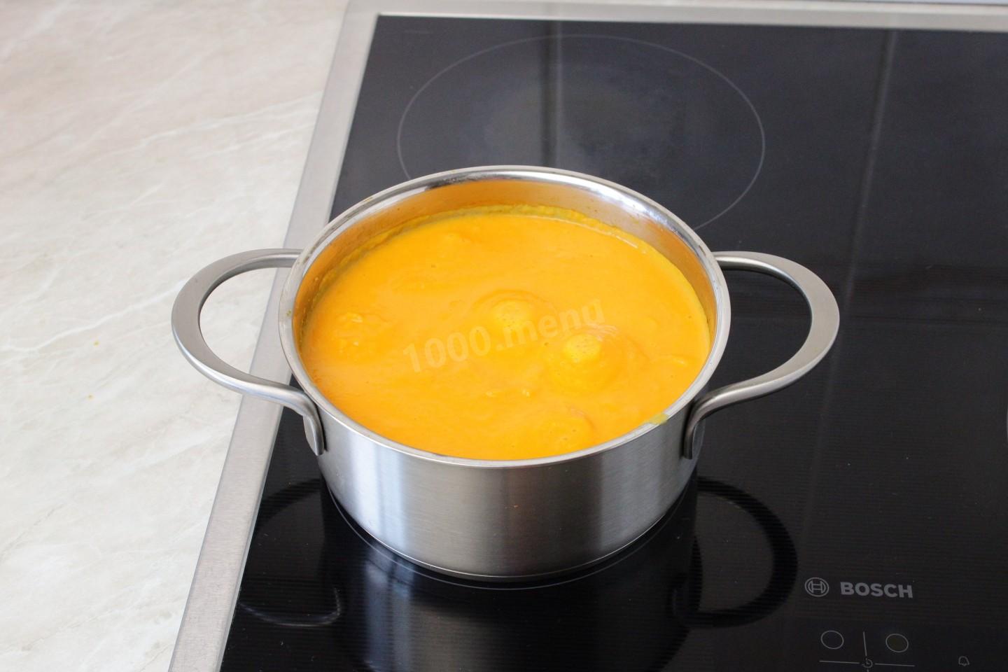 Слейте примерно половину бульона в отдельную емкость. Он понадобится чуть позже. Добавьте в кастрюлю к овощам сливки комнатной температуры и пюрируйте суп погружным блендером до однородной массы. Затем добавьте необходимое количество оставленного бульона и доведите суп-пюре до желаемой консистенции. Верните суп на плиту и на медленном огне, помешивая, доведите до кипения.