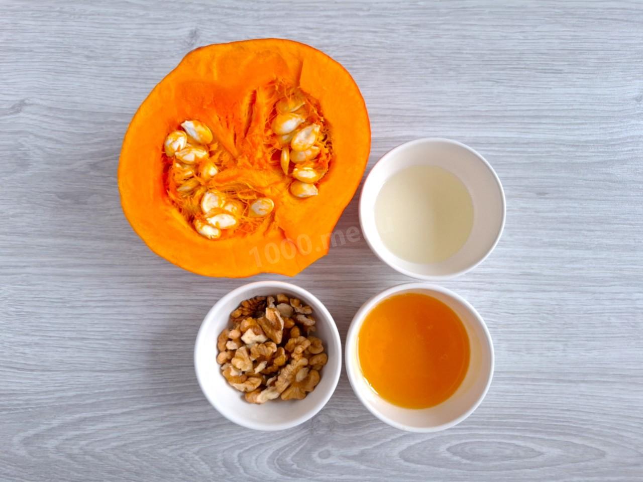 Подготовьте необходимые ингредиенты. Выбирайте сезонную тыкву с яркой и сладкой мякотью. Мед берите натуральный. Если он засахарился, растопите его в микроволновке или на водяной бане. Заменить мед можно любым сиропом по вашему вкусу. В качестве дополнения подойдут любые орехи, кунжут или семена подсолнуха.