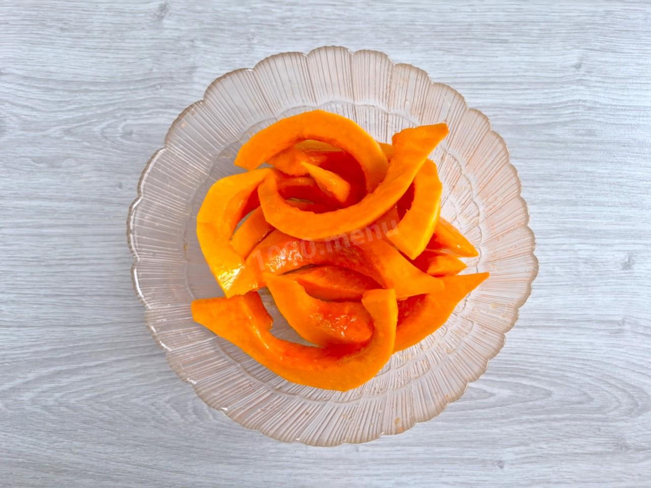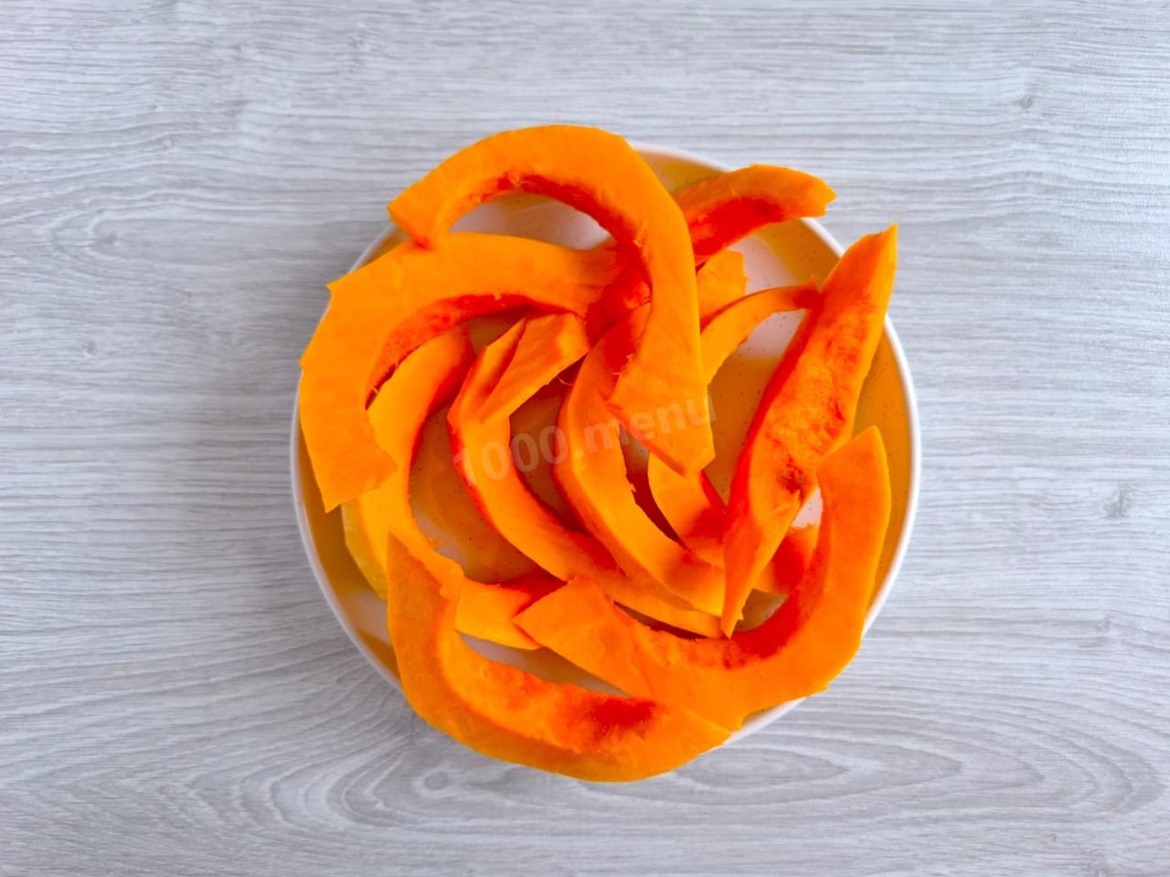 Тщательно вымойте тыкву под проточной водой, удаляя загрязнения, и насухо обсушите бумажным полотенцем. Разрежьте плод пополам вдоль. Столовой ложкой выскребите все семена и волокнистую мякоть, стараясь не повредить плотную мякоть. Нарежьте половинки продольными ломтиками одинаковой толщины — это обеспечит одновременное приготовление всех кусочков. При необходимости очистите ломтики от кожицы.