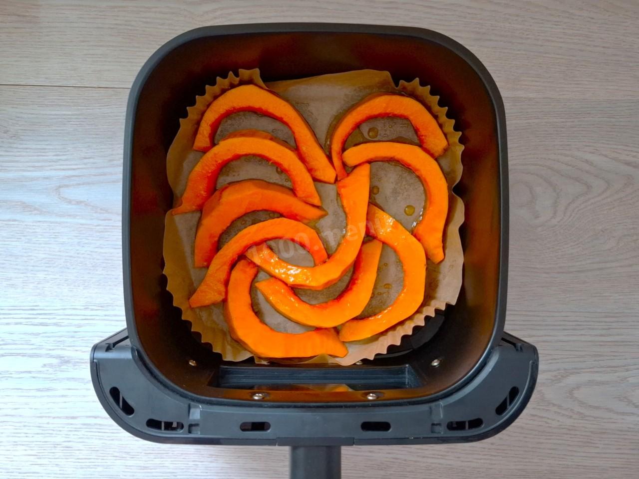 Чашу аэрогриля застелите пергаментом. Выложите ломтики тыквы в один ряд. Кусочки размещайте так, чтобы вокруг них свободно циркулировал горячий воздух. При желании можете использовать силиконовую или стеклянную форму. С выбором пергамента и формы для запекания вам помогут материалы по ссылкам ниже.