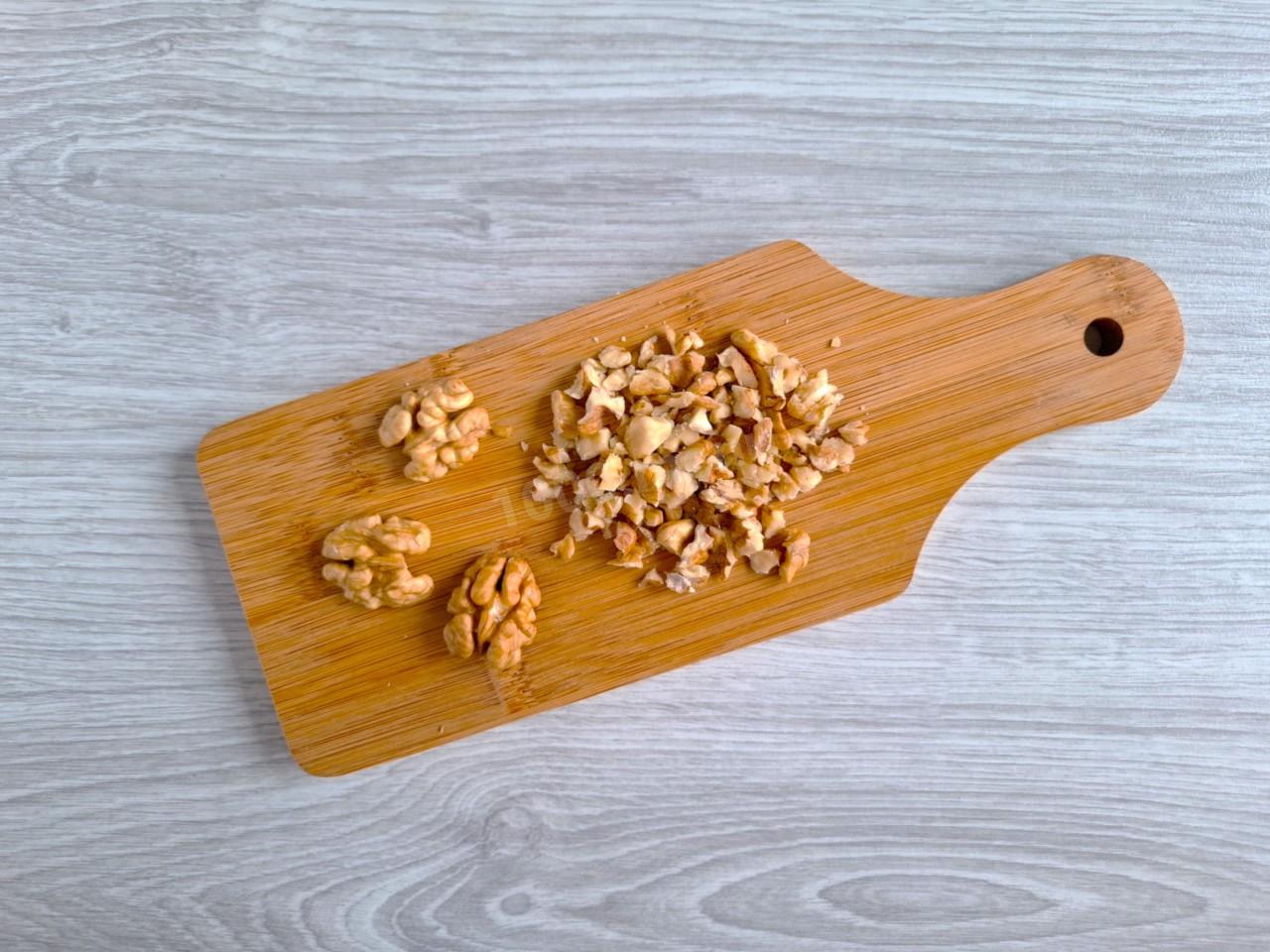 В качестве дополнения можно украсить десерт рубленными орехами. Для этого возьмите любые орехи, у меня грецкие. Просушите орехи на сухой антипригарной сковороде при среднем нагреве 3-5 минут до характерного запаха. Затем порубите орешки ножом в крупную крошку. С выбором сковороды вам поможет статья по ссылке в конце рецепта.