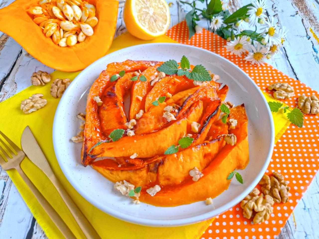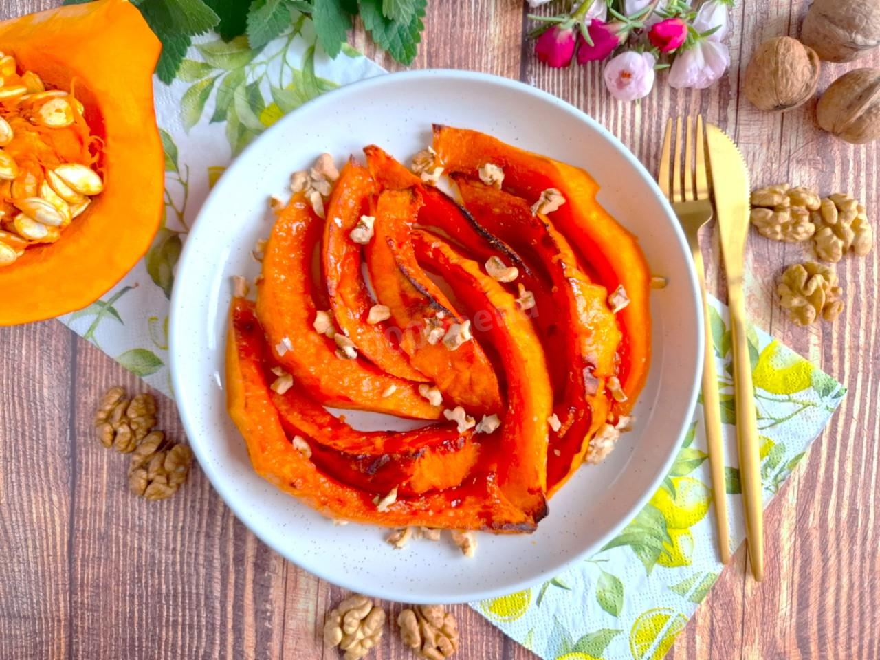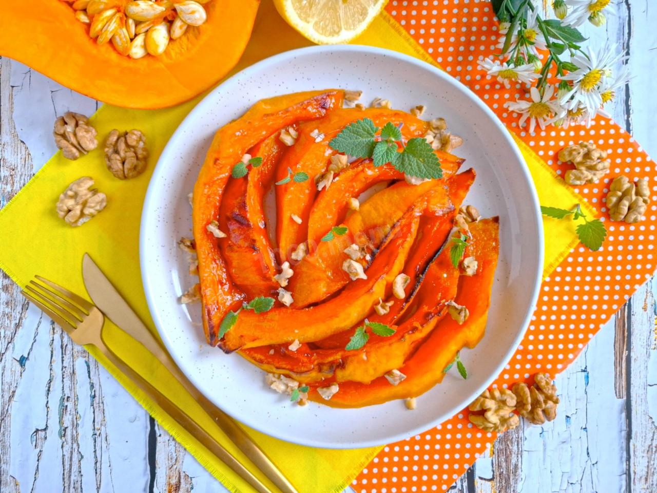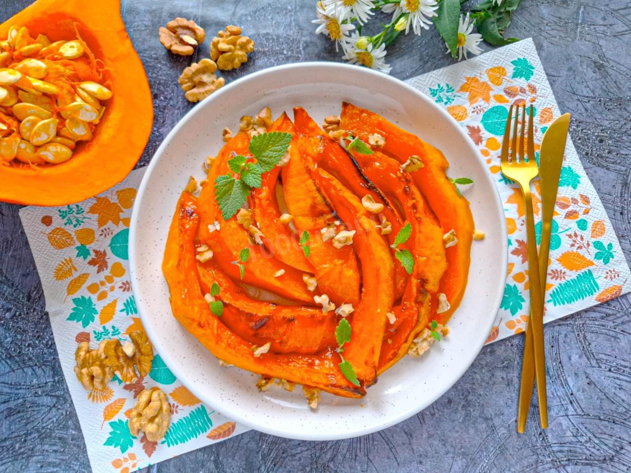 Подавайте тыкву теплой в качестве десерта, посыпав грецкими орехами и с шариком ванильного мороженого или взбитых сливок. В холодном виде отлично сочетается с зеленым салатом и сыром фета.