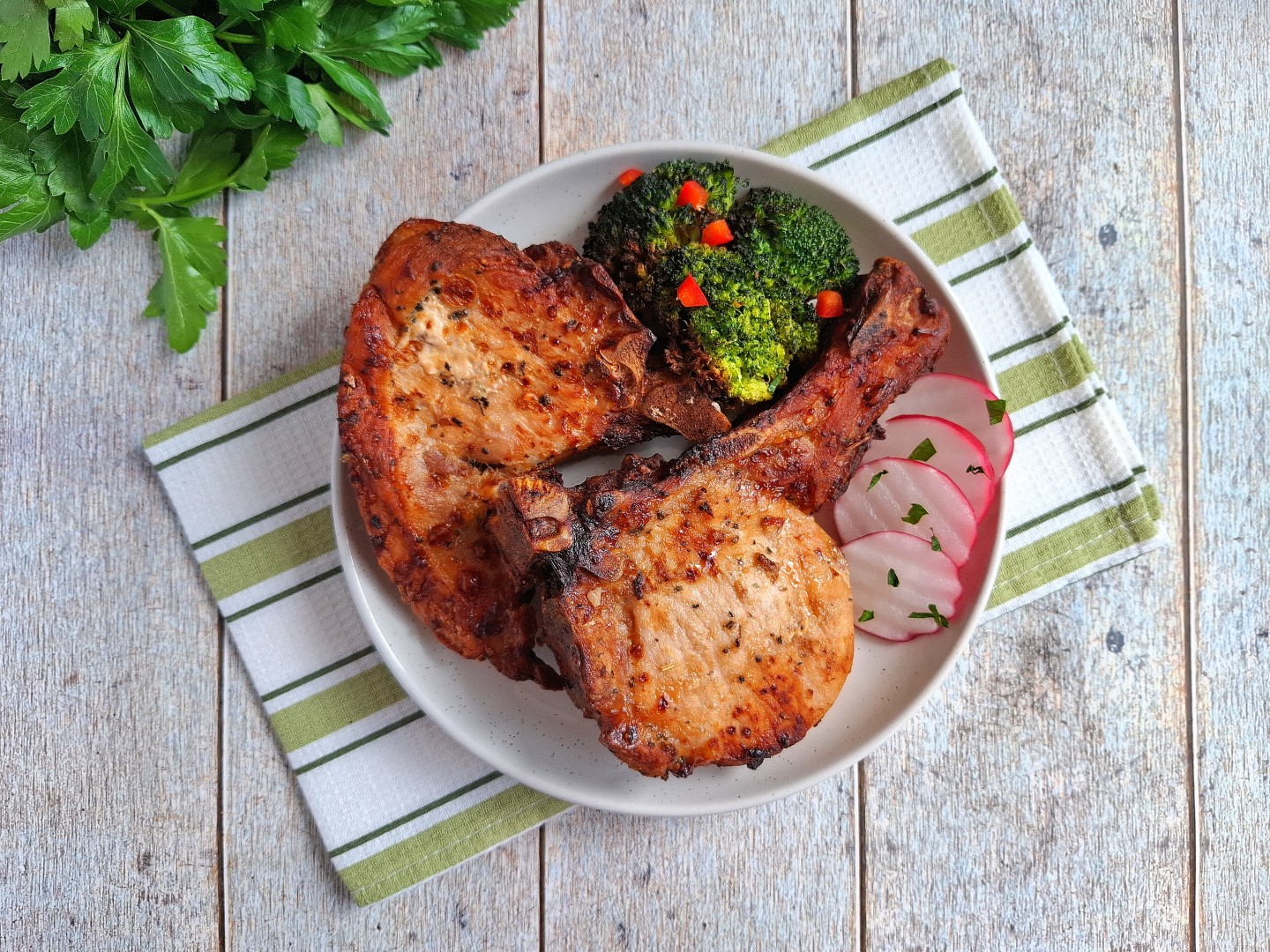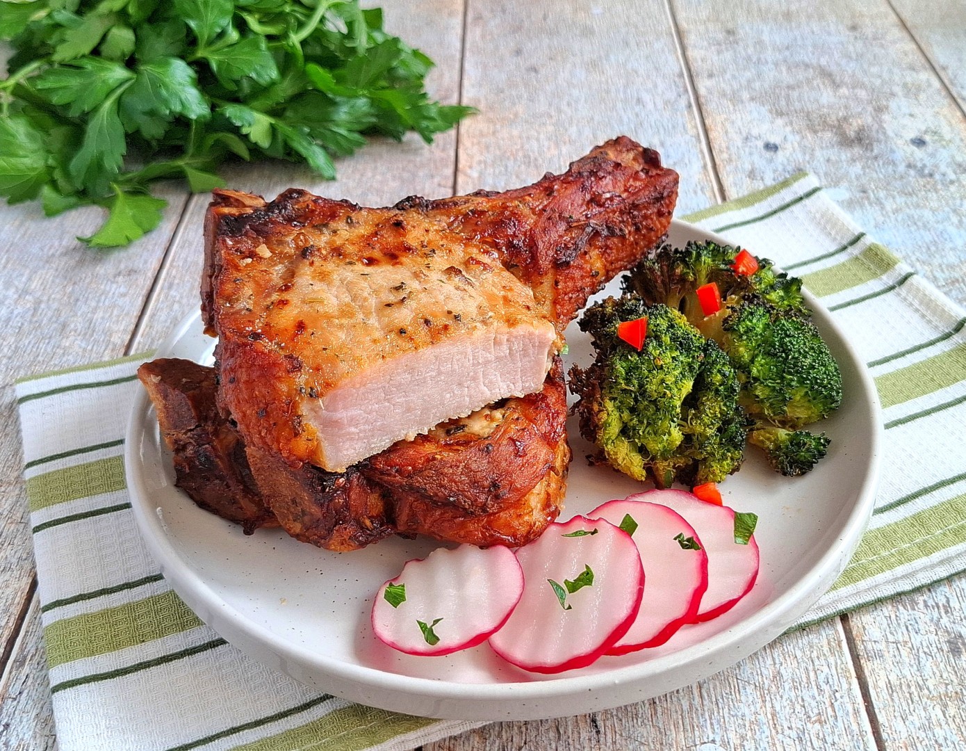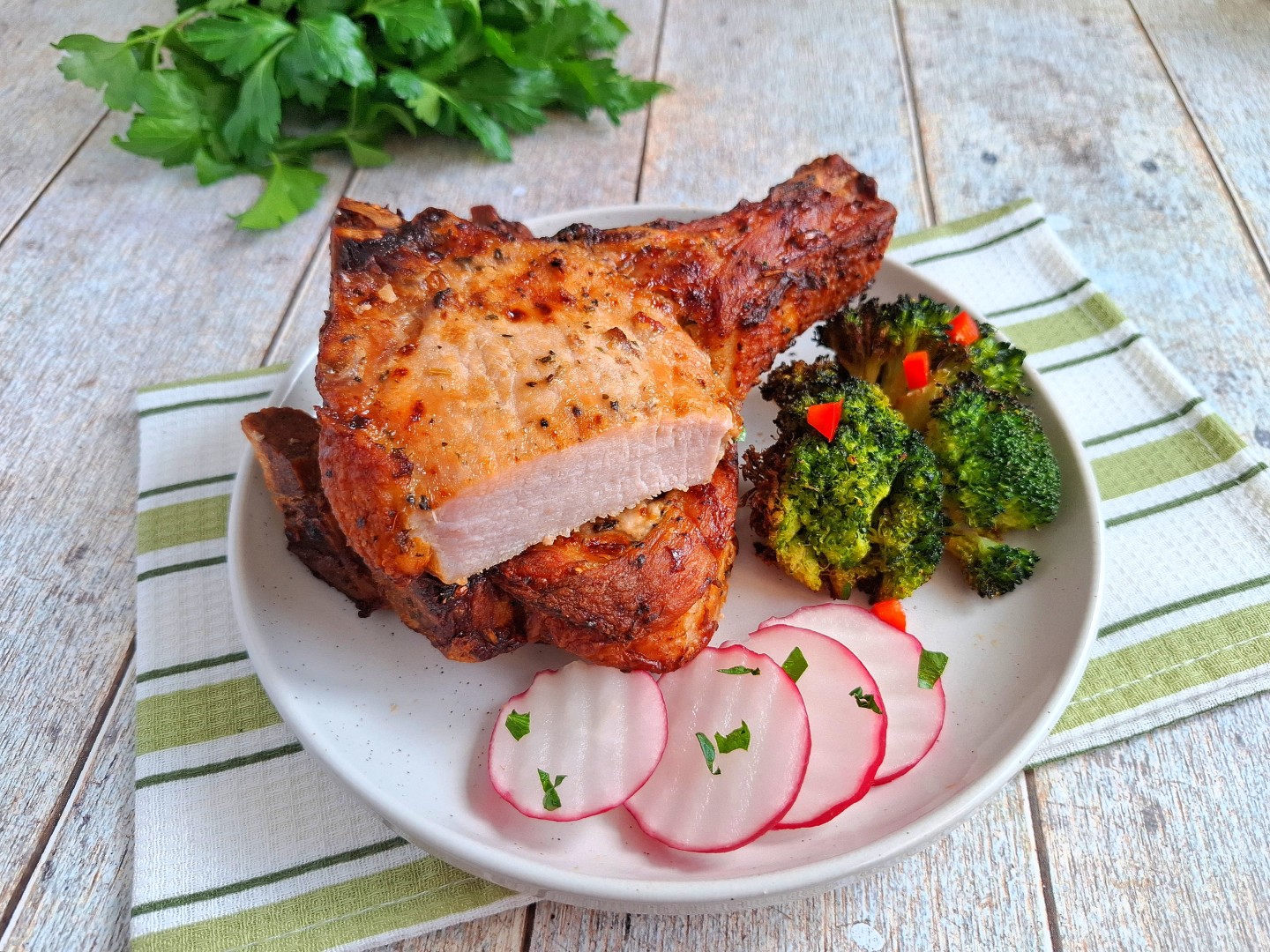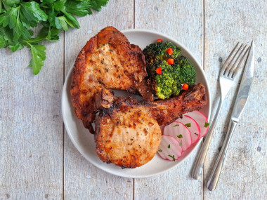 Можете одновременно с мясом приготовить в аэрогриле гарнир, например запечь картошку целиком или кусочками. Стейки из свинины, приготовленные в аэрогриле, разложите по тарелкам и подайте к столу со свежими овощами и зеленью. Приятного аппетита!