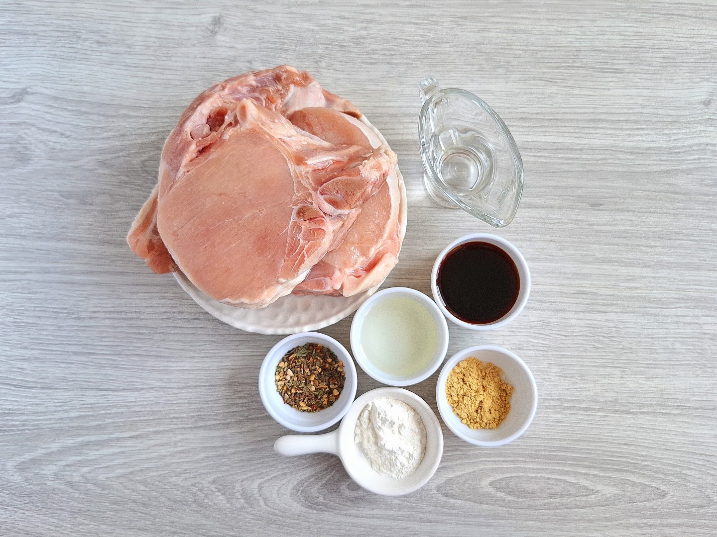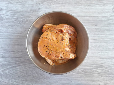 Свиные стейки вымойте и обсушите бумажными полотенцами. Если не любите мясо на кости, можете срезать кость или заменить корейки на карбонад, в котором кость уже вырезана. По этому рецепту можно приготовить и другие части свинины, например, окорок или лопатку. Но их нужно также нарезать ломтями толщиной около 1,5 см или кусочками. Для запекания мяса большим целым куском нужно завернуть мясо в фольгу и увеличить время запекания.Шаг 3. Как сделать маринад для стейка из свинины в аэрогриле?