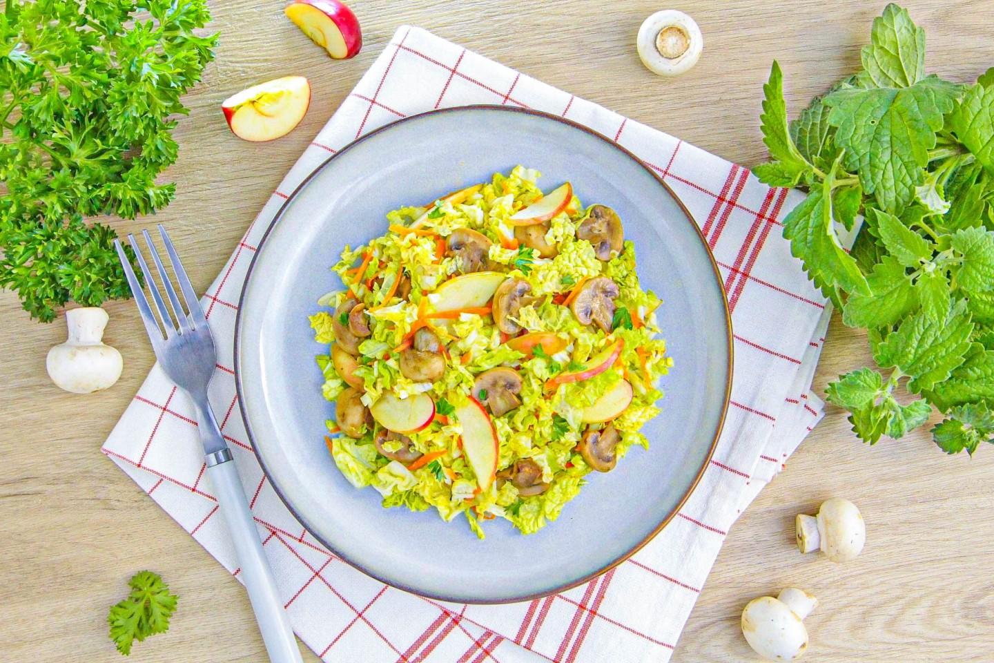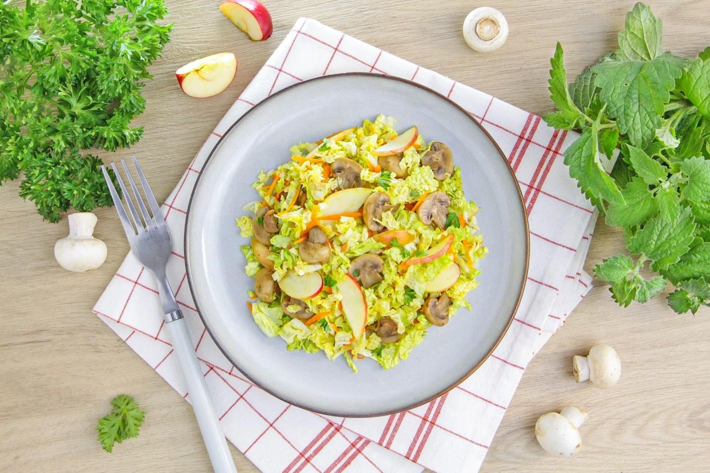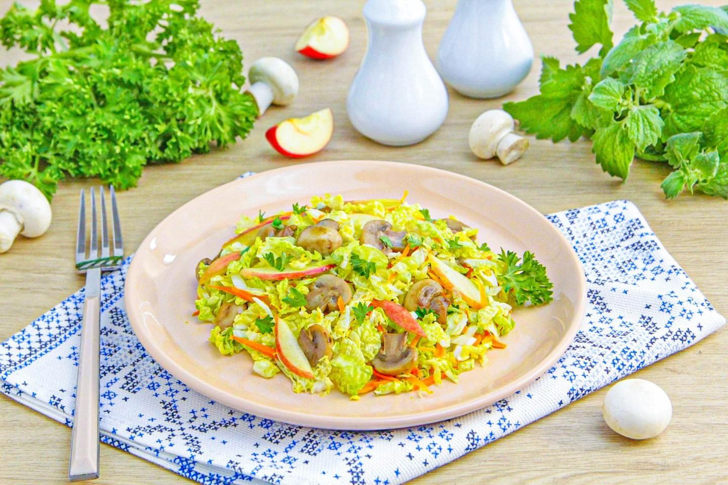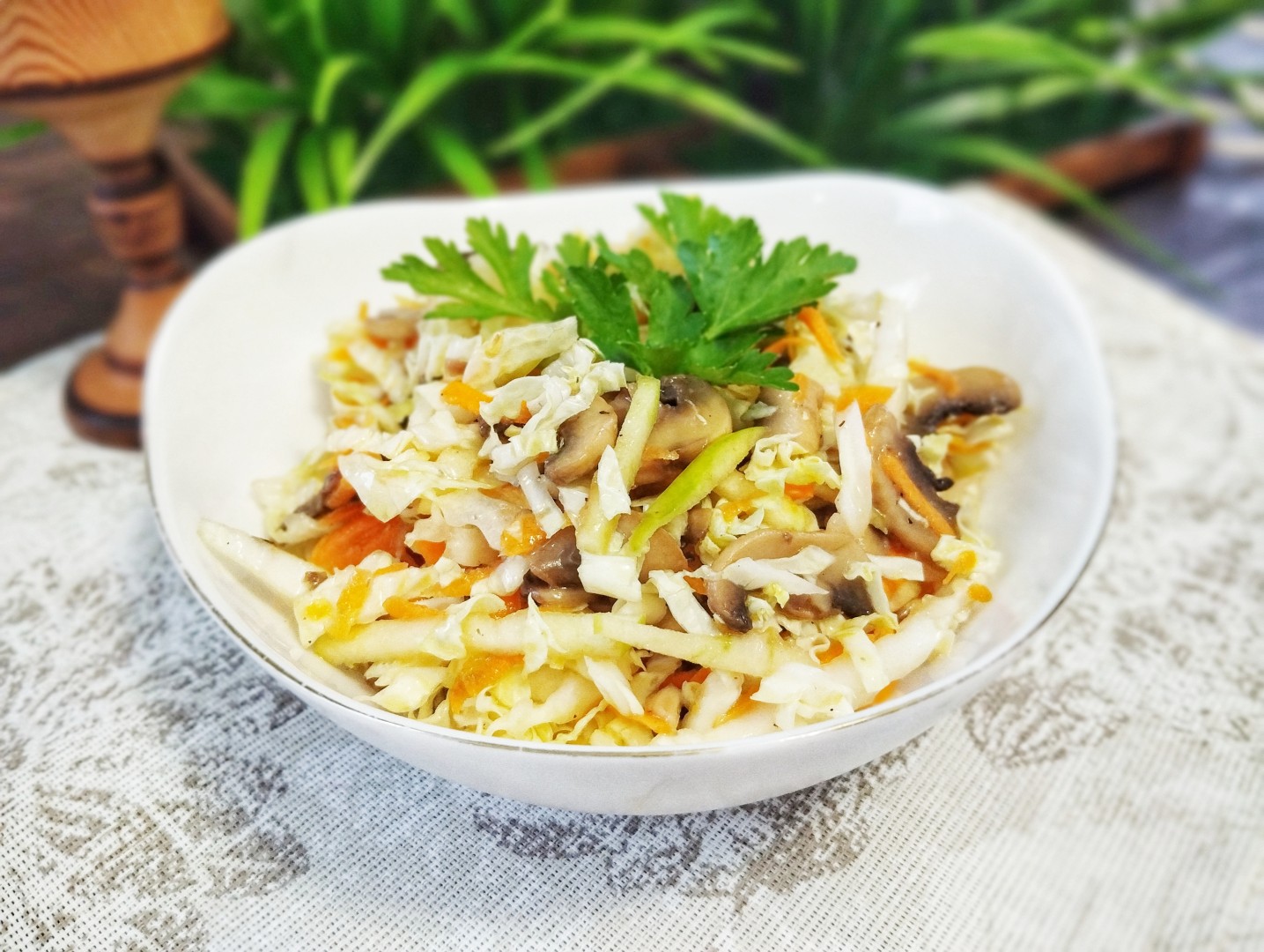 Сочетание капусты и грибов – классика славянской кухни, которую часто готовили в пост. Наш рецепт – это современная интерпретация: мы используем нежную пекинскую капусту вместо белокочанной и добавляем яблоко для свежей кислинки, что делает салат более легким и изысканным.