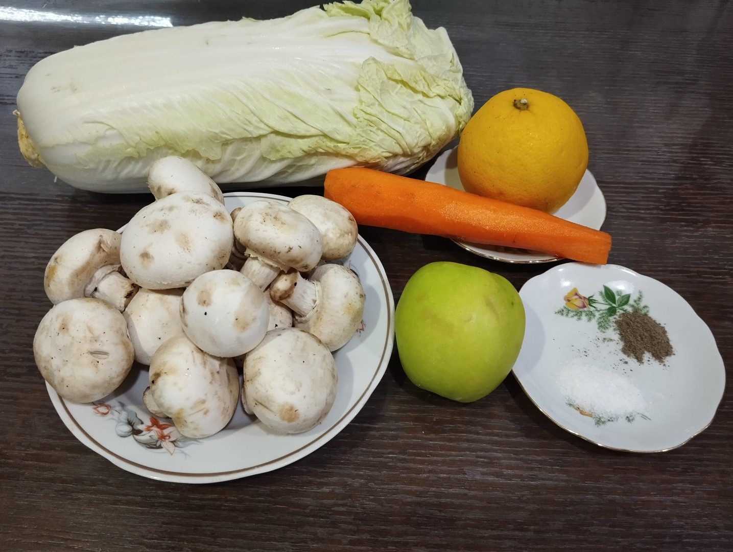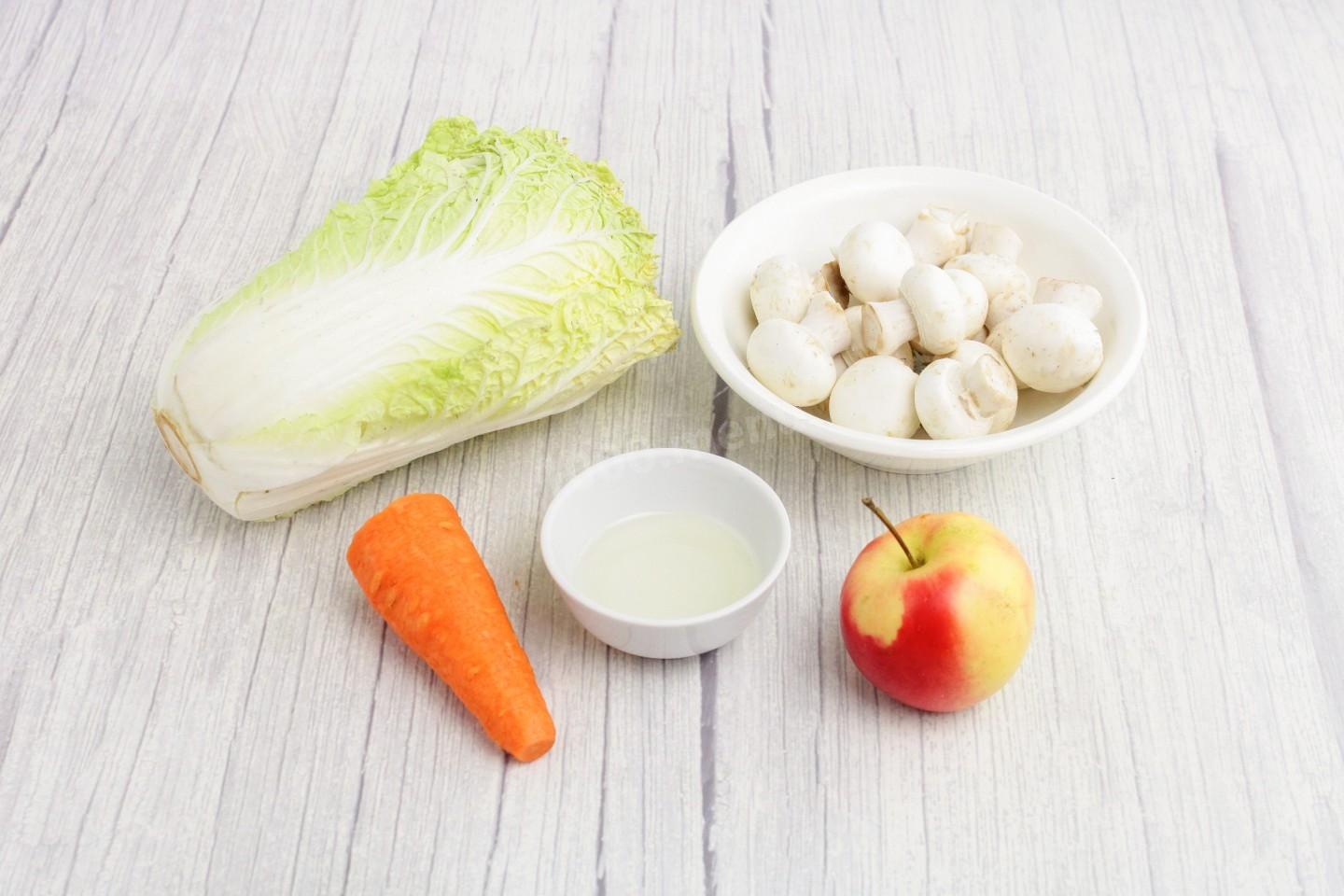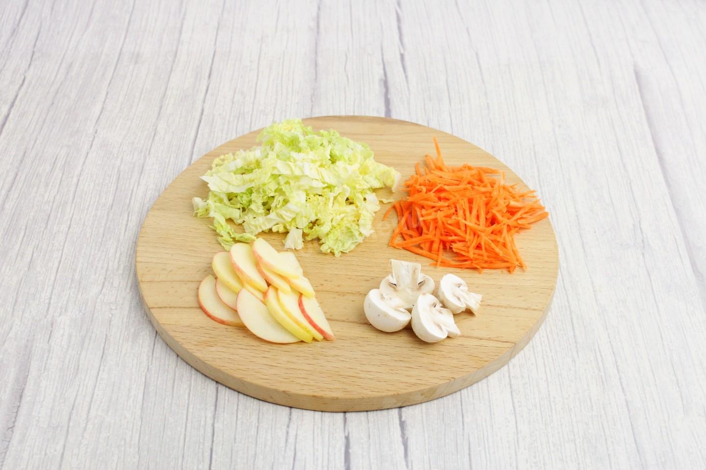 Овощи и яблоко помойте. Морковь очистите, сполосните, натрите на крупной терке. Я воспользовалась теркой для корейской моркови. Пекинскую капусту нашинкуйте соломкой. Яблоко очистите от семян, по желанию срежьте кожицу. Нарежьте яблоко тонкими дольками или небольшими кубиками. Вымытые и очищенные от пленок шампиньоны выложите на кухонное полотенце, чтобы оно впитало лишнюю жидкость. Оставьте на 15-20 минут, чтобы вся влага впиталась в ткань.