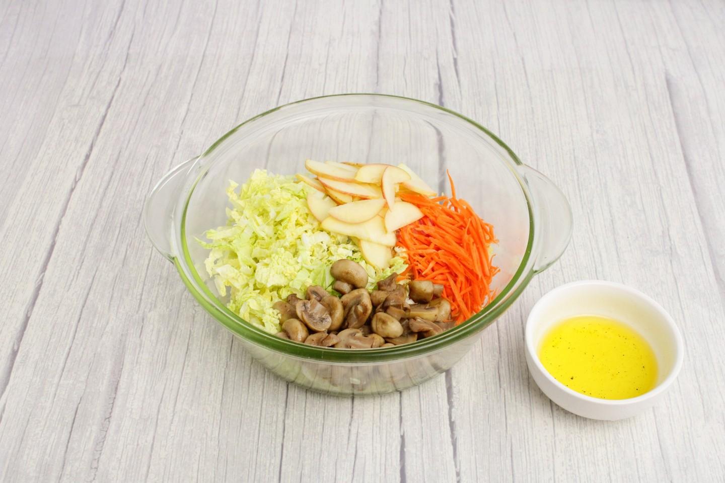 В миску или салатник выложите пекинскую капусту, жареные грибы, морковь и яблоко. Полейте салат масляной заправкой и перемешайте.