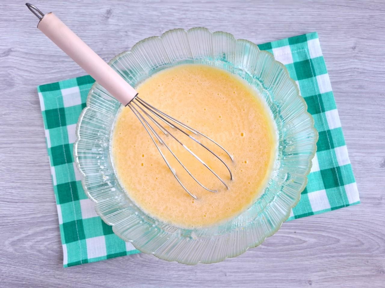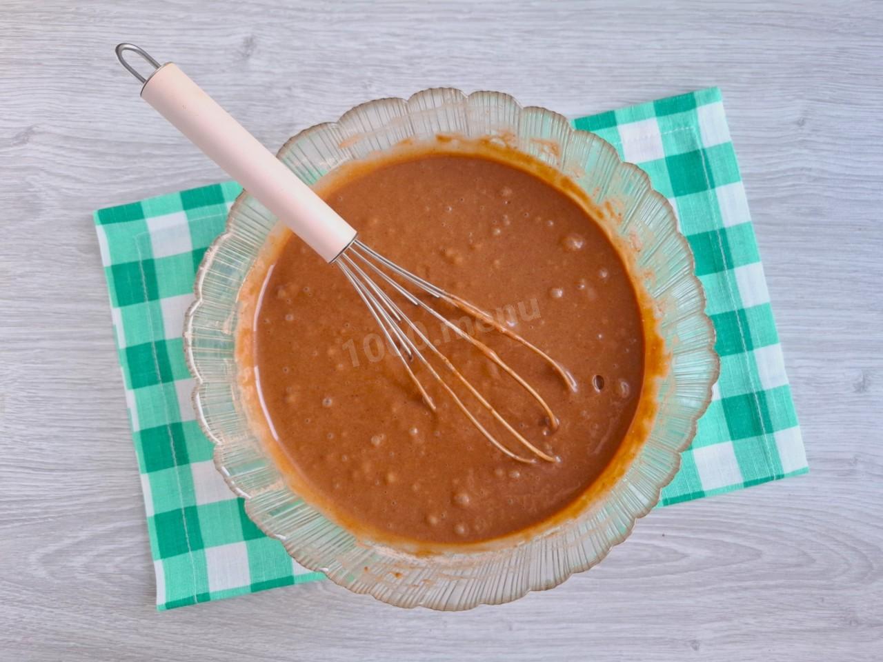 Постепенно добавляйте сухую смесь в яичную, перемешивая венчиком до однородности. Тесто должно получиться гладким, слегка густоватым. Муки может понадобиться больше или меньше, ориентируйтесь на консистенцию теста.