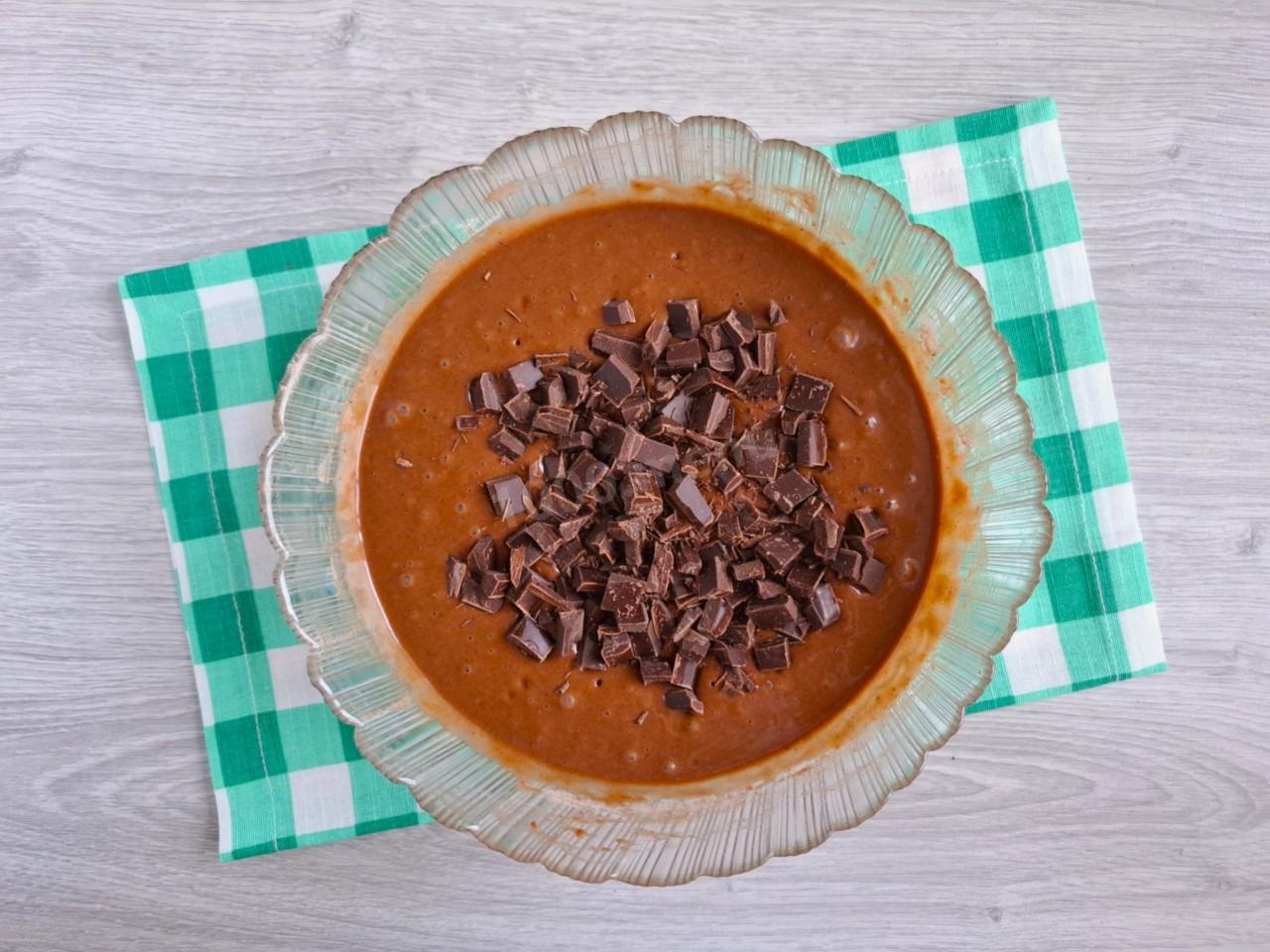 Шоколад порубите ножом в крупную крошку. Можете воспользоваться готовыми шоколадными каплями. Аккуратно вмешайте шоколадную крошку в тесто.