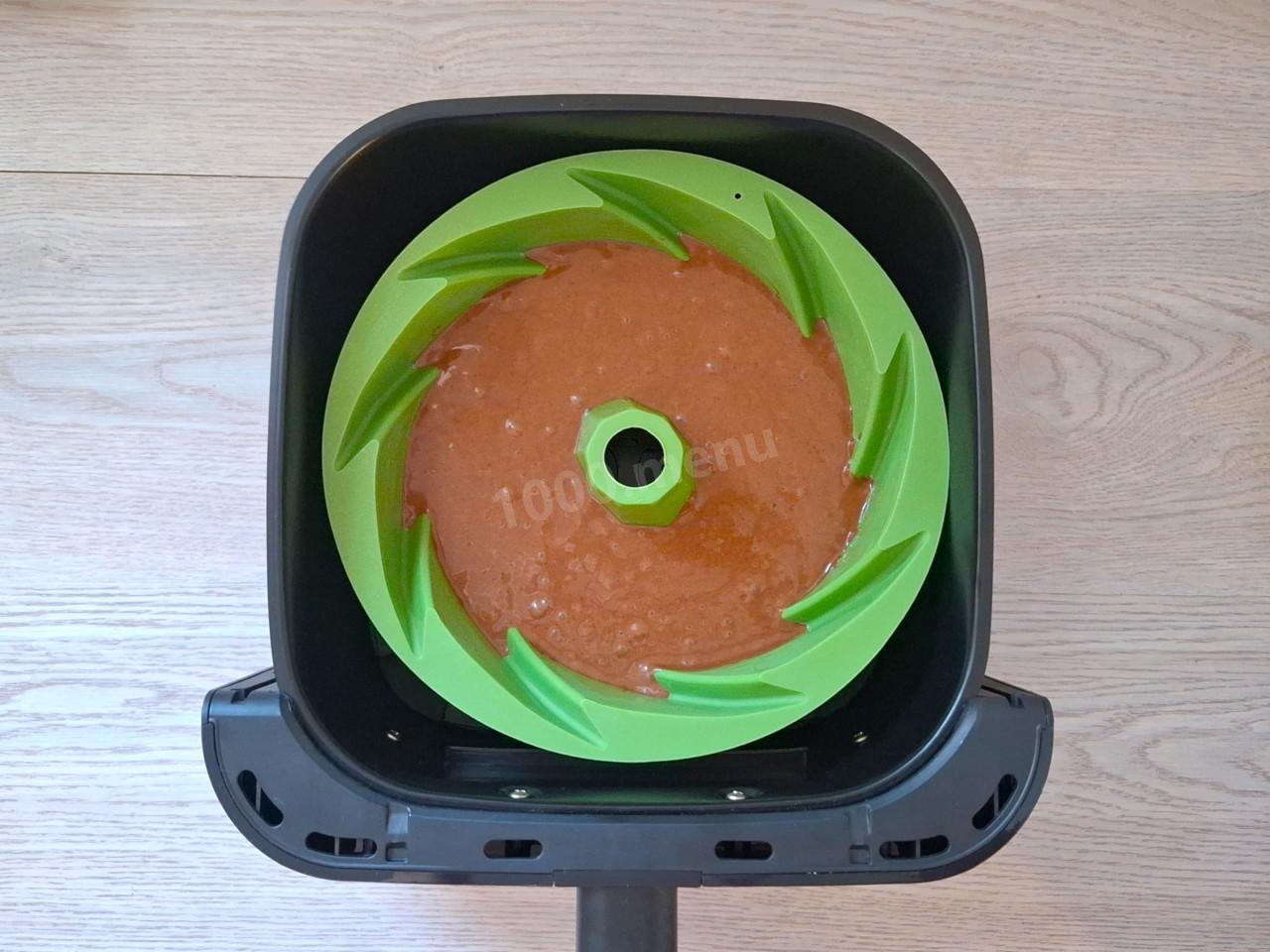 Выложите тесто в силиконовую форму с отверстием. Так кекс лучше пропечется. Учитывайте размер формы, она должна поместиться в чашу аэрогриля. У моей верхний диаметр 24 см. Поверхность теста разровняйте, а форму поставьте в чашу.