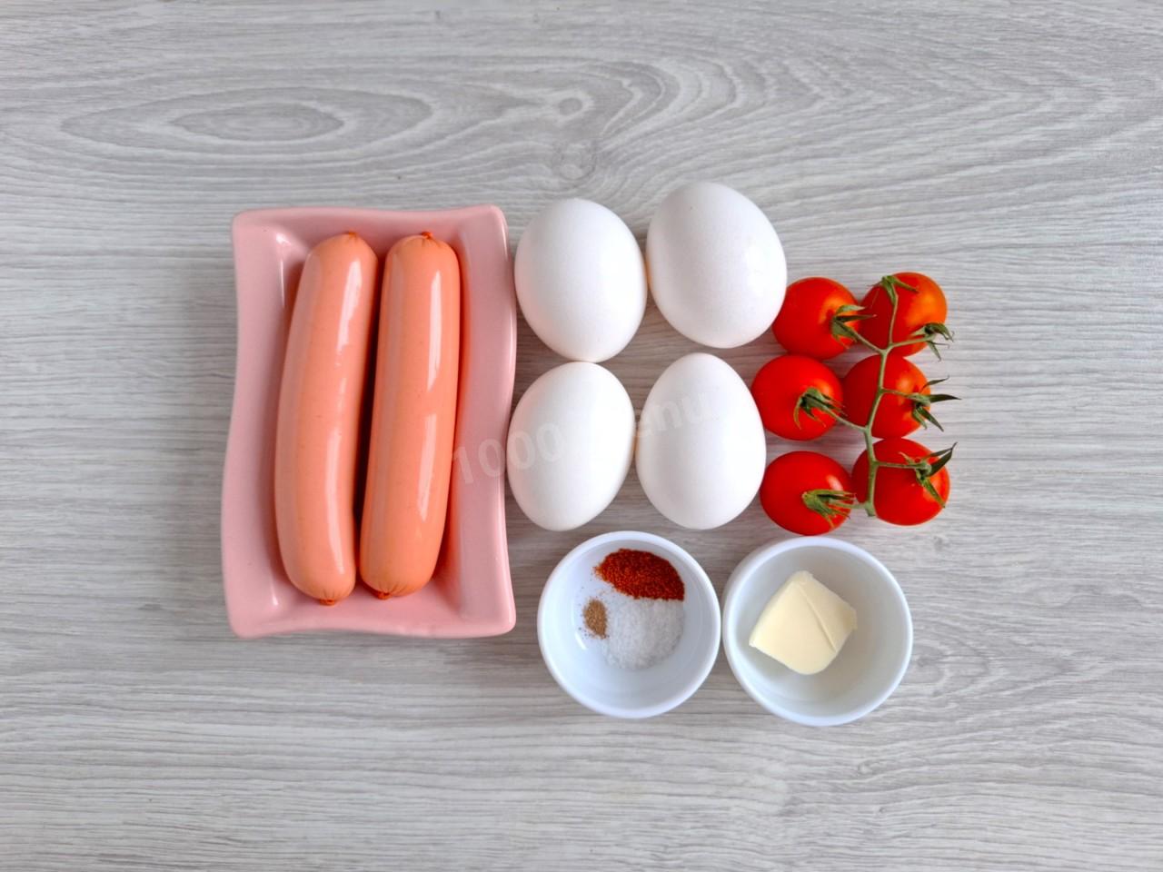 Подготовьте необходимые продукты. Количество ингредиентов вы можете менять в зависимости от размера формы и своих предпочтений. Помидоры черри можно заменить обычными помидорами. Выбирайте сочное, но плотные плоды, чтобы во время приготовления они не потеряли форму. Кроме сосисок подойдут любые колбасные изделия или отварное мясо. Специи можете взять любые на свой выбор. Помидоры помойте в проточной воде и обсушите.