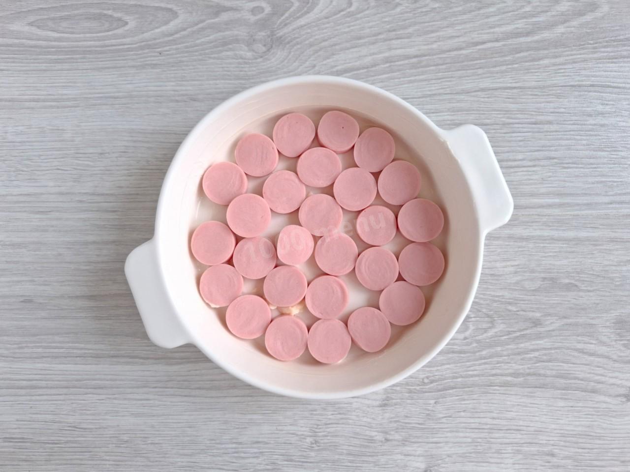 Форму смажьте кусочком сливочного масла, растительное без запаха тоже подойдет. У меня форма диаметром 16 см. Сосиски освободите от оболочки и нарежьте кружочками. Выложите нарезанные сосиски на дно формы. О том, как выбрать форму читайте в статье по ссылке в конце рецепта.