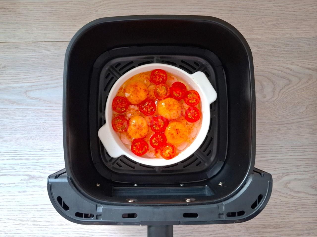 Форму установите в чашу аэрогриля. Старайтесь не перегружать решетку, чтобы горячий воздух свободно циркулировал вокруг формы. Если хотите получить жидкий желток, то затяните форму фольгой.