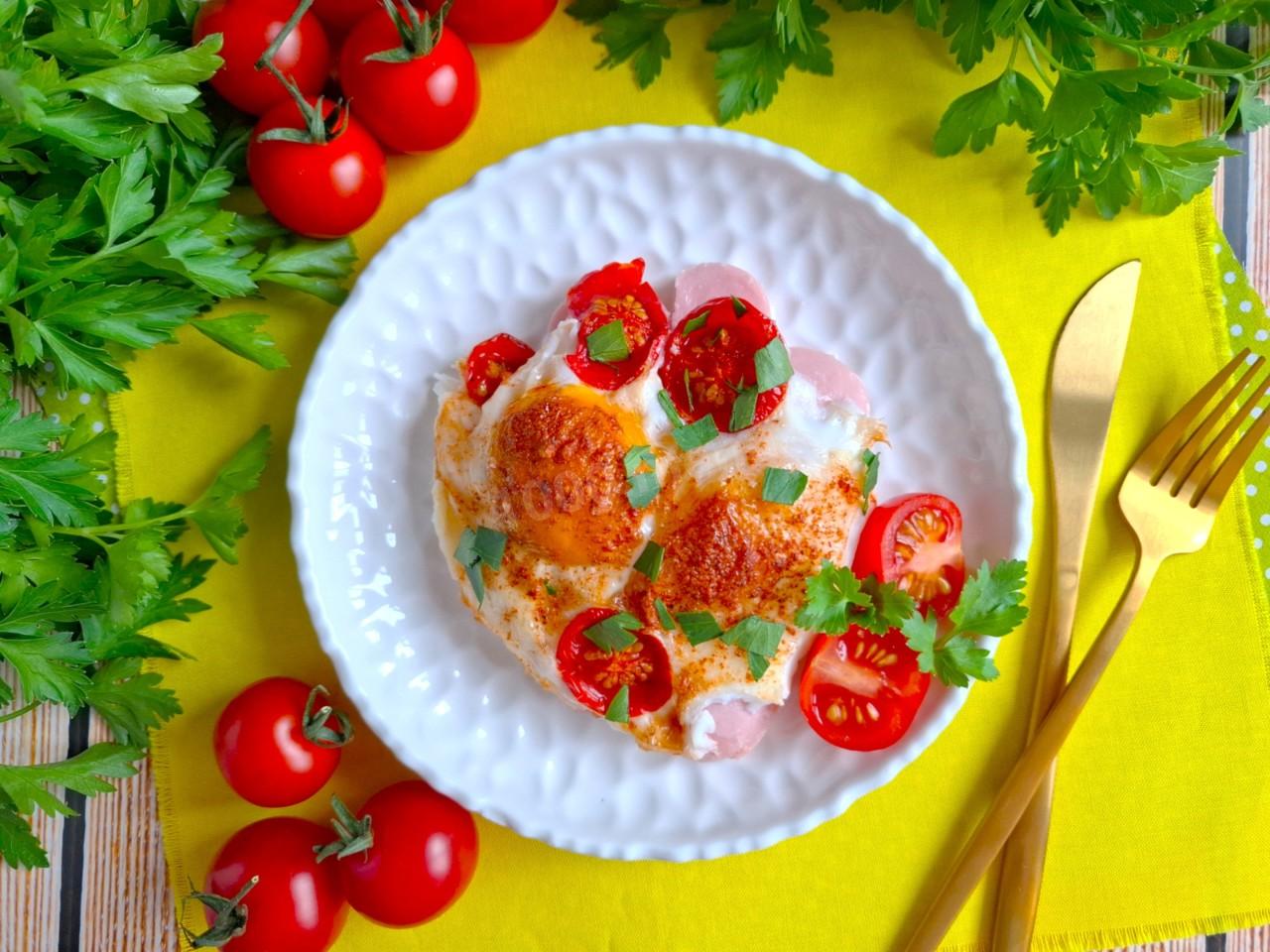 Яичницу подавайте сразу же горячей. Предложите к ней свежие овощи и украсьте любимой зеленью. Приятного аппетита!