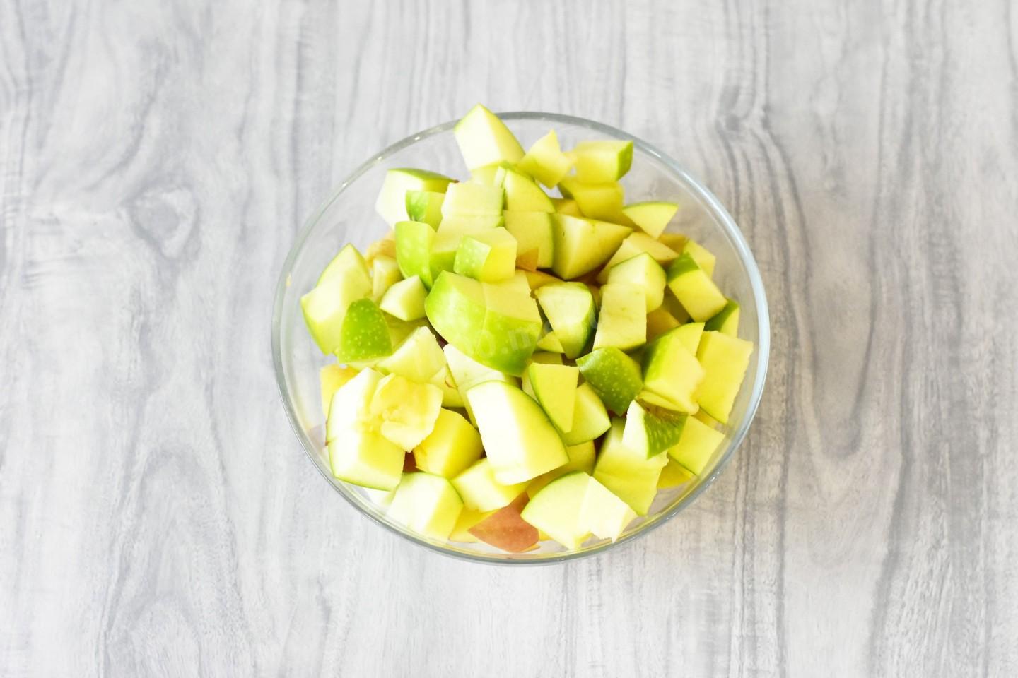 Яблоки можете использовать любые, но лучше кисло-сладкие, с упругой плотной мякотью. Яблоки с рыхлой мякотью могут быстро развариться в пюре, а нам нужно сохранить кусочки целыми. Подробнее о яблоках читайте в статье. Ссылка в конце рецепта. Яблоки вымойте, обсушите бумажным полотенцем, очистите от семян и нарежьте мелкими кубиками.