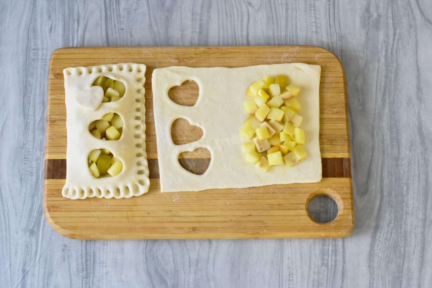 Слоеное тесто раскатайте на присыпанном мукой столе и нарежьте прямоугольниками. У меня с каждой пластины получилось по 4 прямоугольника. Всего 8 заготовок. С одной стороны теста вырубкой вырежьте кусочки теста, отступив от краев около 2 см. На противоположный край полоски, также отступив 2 см, выложите 1-2 ст. л. яблочной начинки. Накройте начинку краем теста с отверстиями и прижмите края. Я защипываю с помощью ложки.