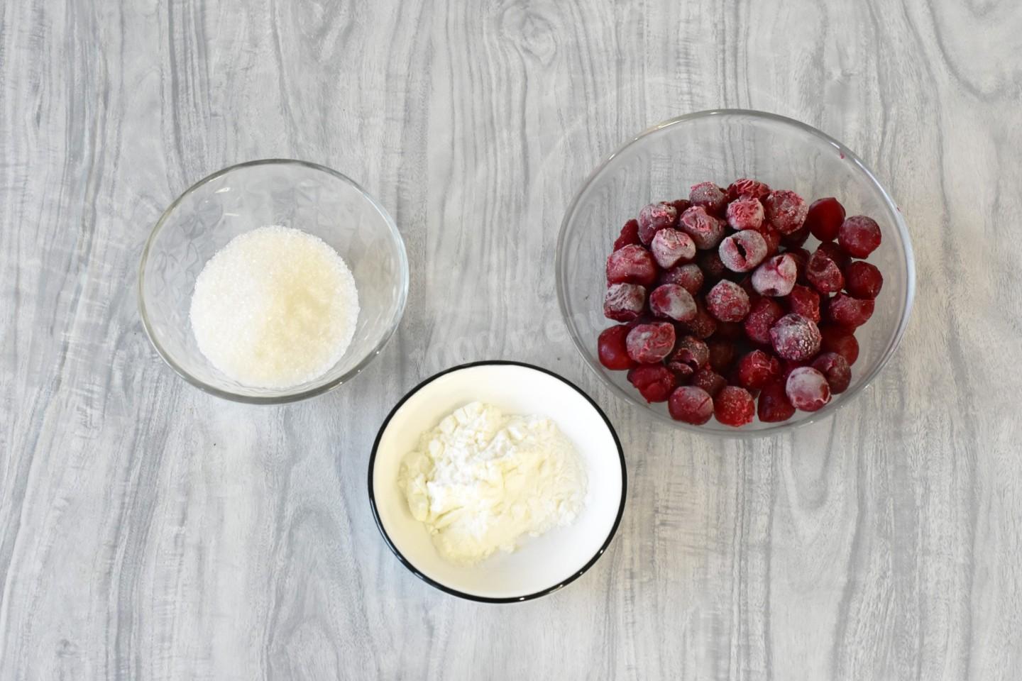Для начала приготовьте необходимые ингредиенты для начинки. Удобнее делать начинку из замороженной вишни без косточек, так как в ягодах сохранены все соки. В таком случае ягоду предварительно разморозьте. Если вишня свежая, то из нее удалите косточки и по возможности соберите и сохраните выделившийся сок.