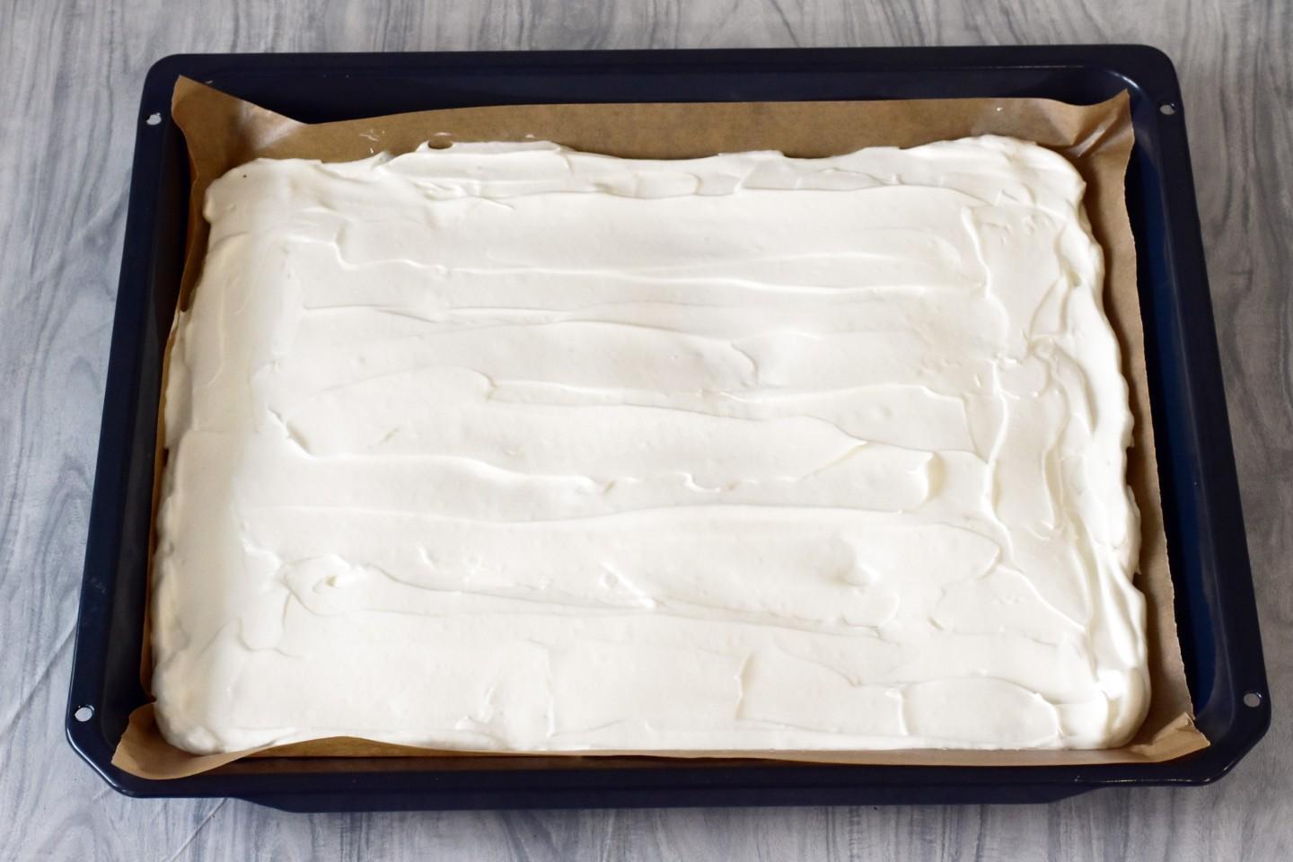 На застеленный пергаментом противень выложите меренгу и разровняйте. Выпекайте корж в разогретой до 150℃ духовке около 25 минут. Время выпекания зависит от вашей духовки. Узнать об особенностях работы духовок и о том как правильно выбрать пергамент можно из отдельных статей, ссылки в конце рецепта. О том, как определить готовность меренгового коржа, так же читайте в конце рецепта.
