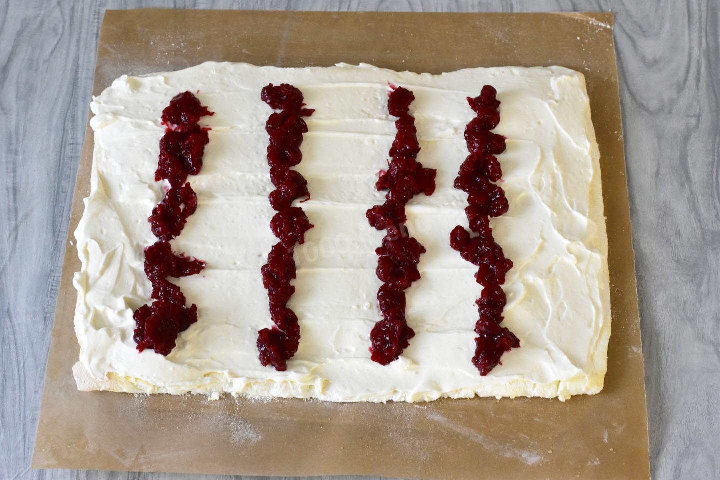 Шаг 7. Как правильно распределить крем и начинку по меренговому коржу и свернуть его в рулет?