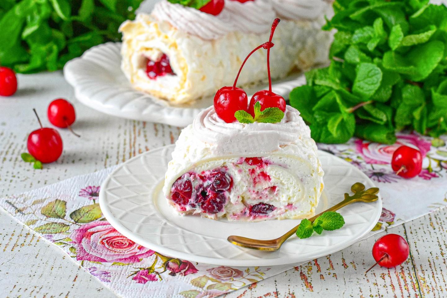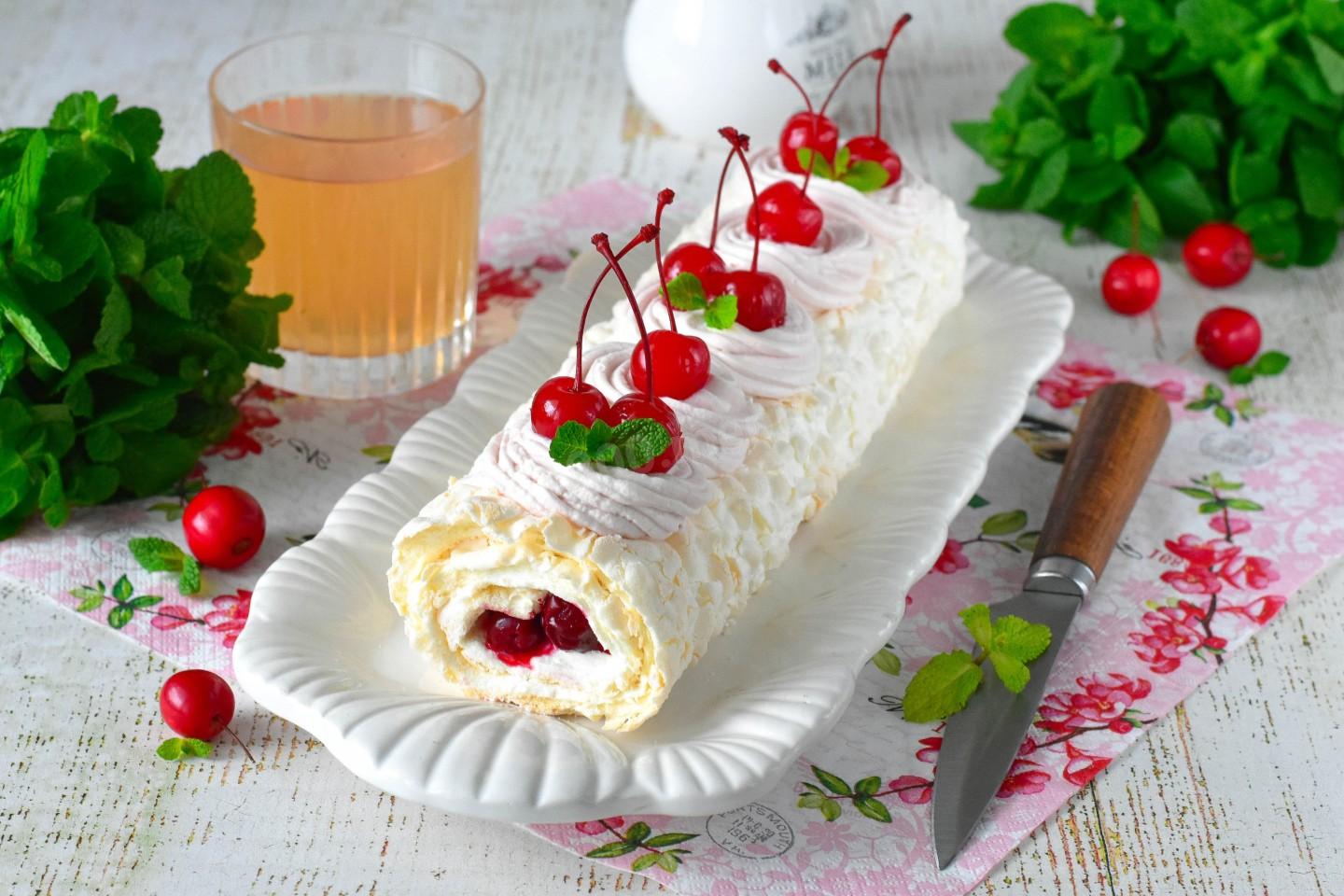 Этот меренговый рулет с вишней — отличный вариант для тех, кто ищет десерт без муки. Белки, основной ингредиент, являются источником протеина, а вишня содержит антиоксиданты и витамины. Использование творожного сыра в креме делает его менее калорийным, чем на pure сливочном масле.