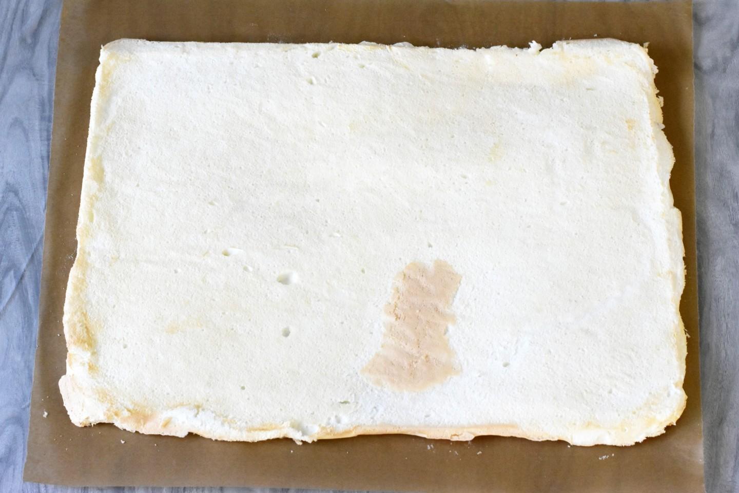 Для этого готовый меренговый корж накройте листом пергамента и переверните. Снимите пергамент, на котором выпекался корж. Меренгу охладите. Чтобы рулет точно не треснул при скручивании, сделайте на еще теплом корже неглубокий надрез вдоль края, отступая 2-3 см.