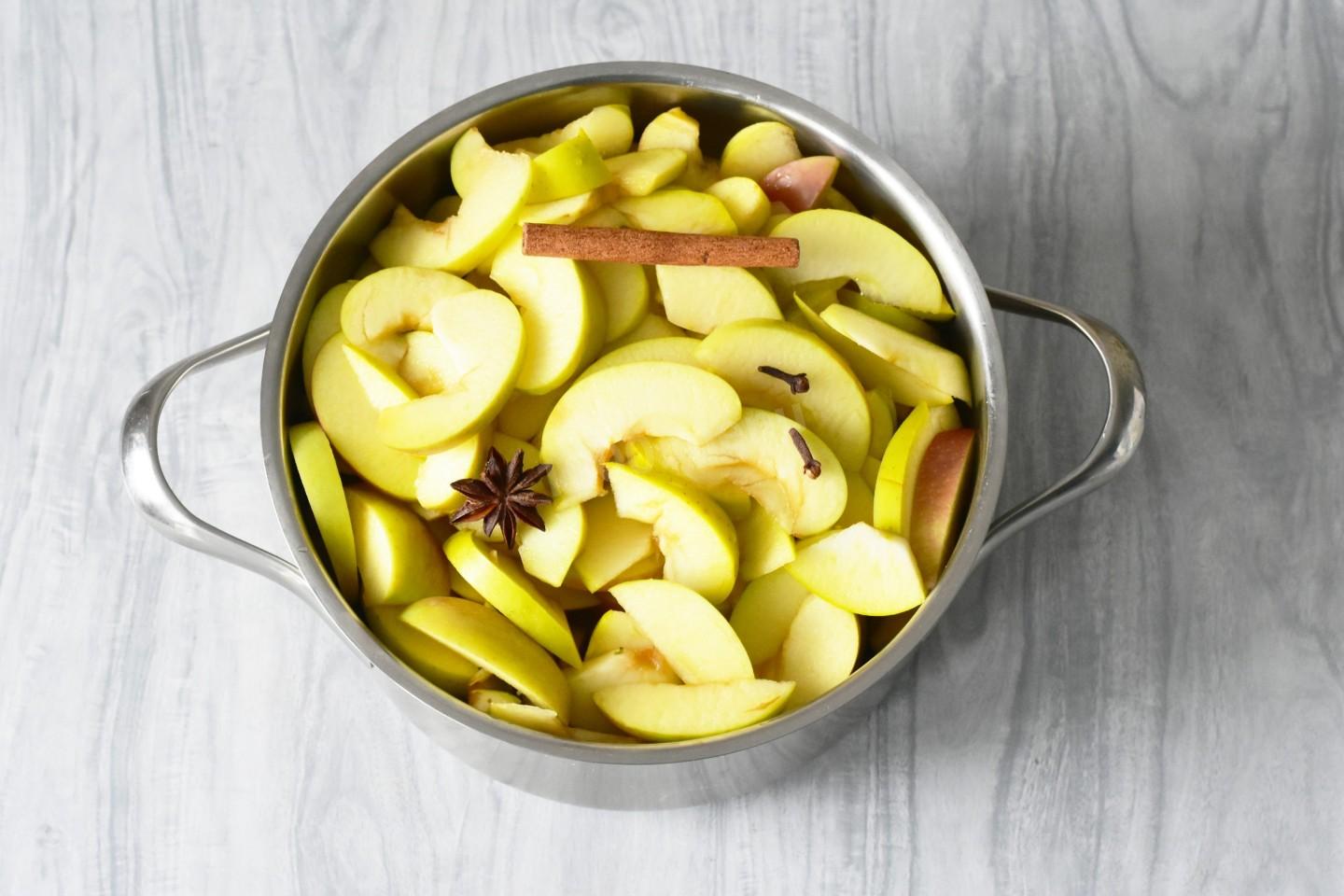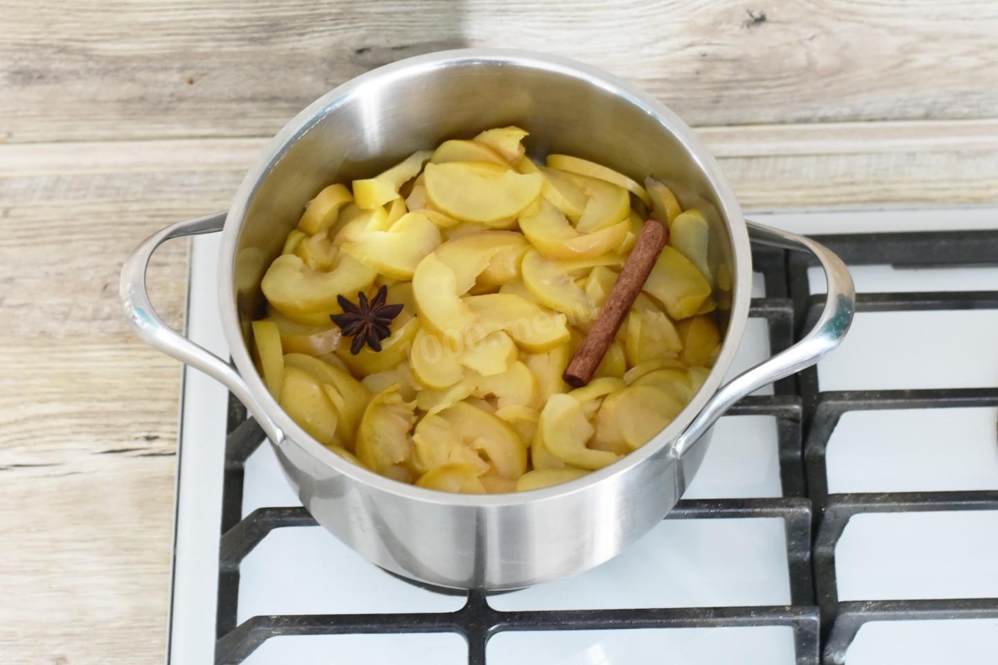 Яблоки тщательно промойте Удалите плодоножки и семена, срежьте битые участки. Яблоки нарежьте дольками. Кожицу можете оставить. Выложите яблоки в металлическую кастрюлю в толстым дном. Влейте воду. Она нужна, чтобы яблоки не подгорели до выделения ими сока. Добавьте корицу, бадьян и гвоздику.