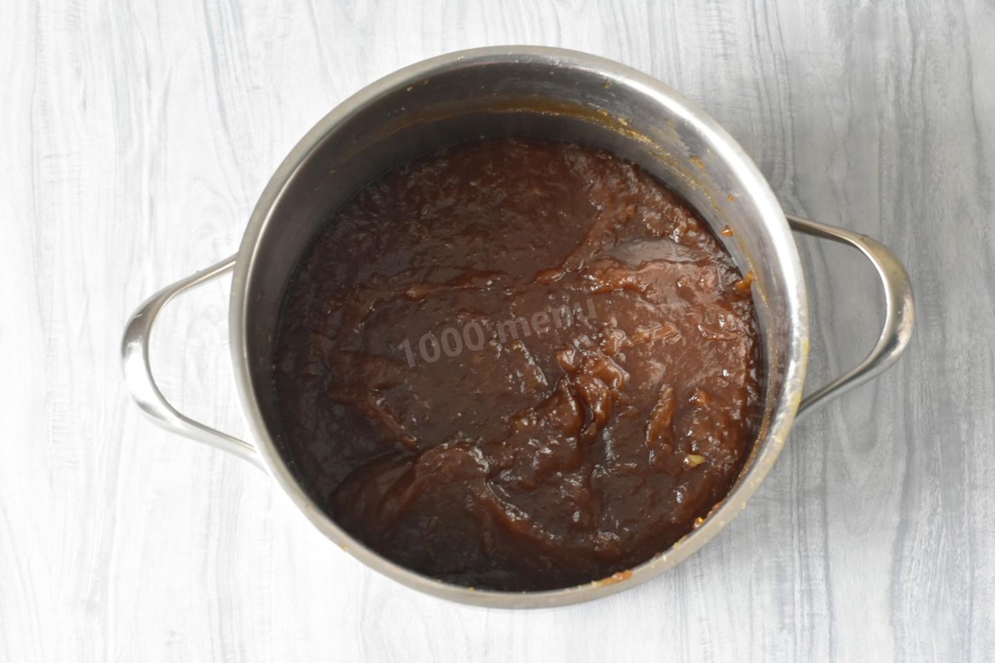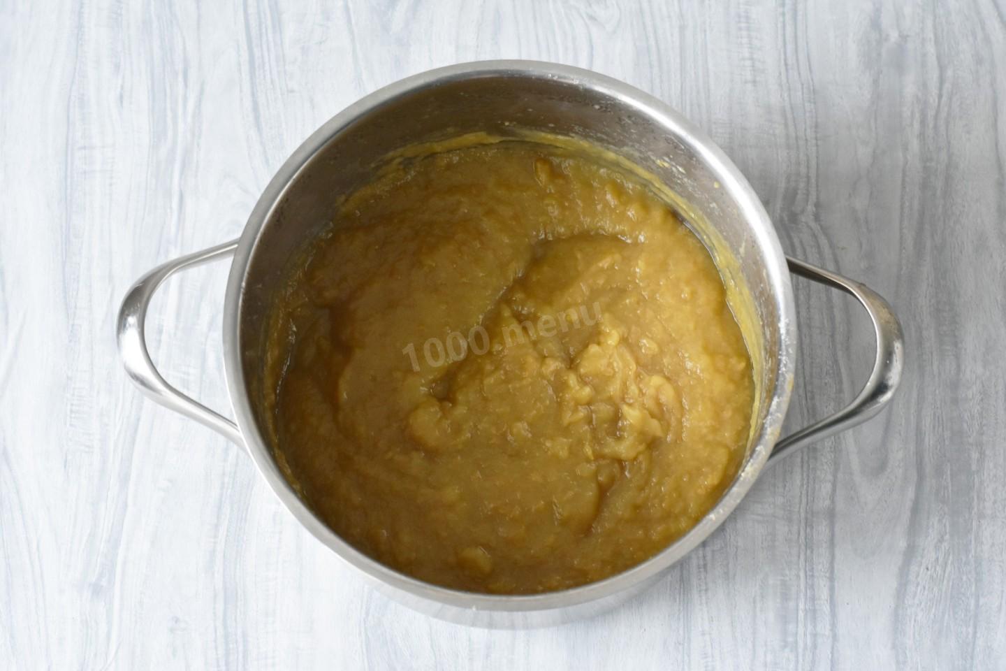 На среднем огне, постоянно помешивая деревянной лопаткой, уваривайте пюре до загустения. Готовность определяется по трем признакам: масса темнеет до золотисто-карамельного оттенка, начинает отделяться от дна посуды и оставляет четкий след при проведении лопаткой. Непрерывно помешивайте массу для предотвращения подгорания.