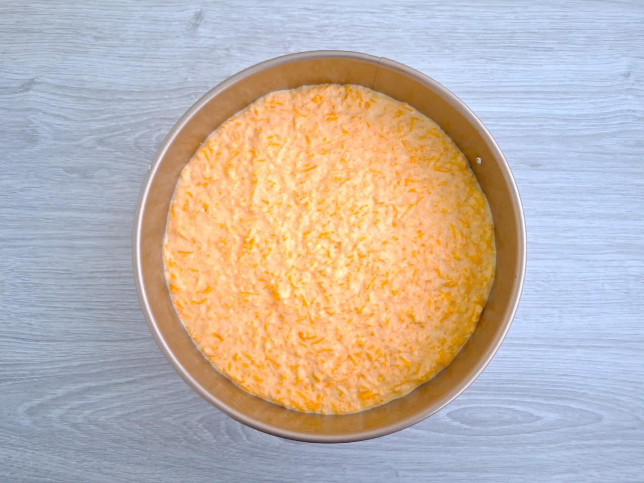 Сода нейтрализует кисловатый привкус кефира, а разрыхлитель сделает структуру теста воздушнее. Тесто перемешайте ложкой или лопаткой. Дно формы застелите пергаментом, а стенки смажьте каплей растительного масла. Выложите тесто в форму и разровняйте. У меня разъемная форма диаметром 22 см.