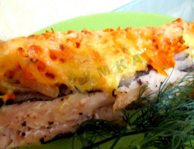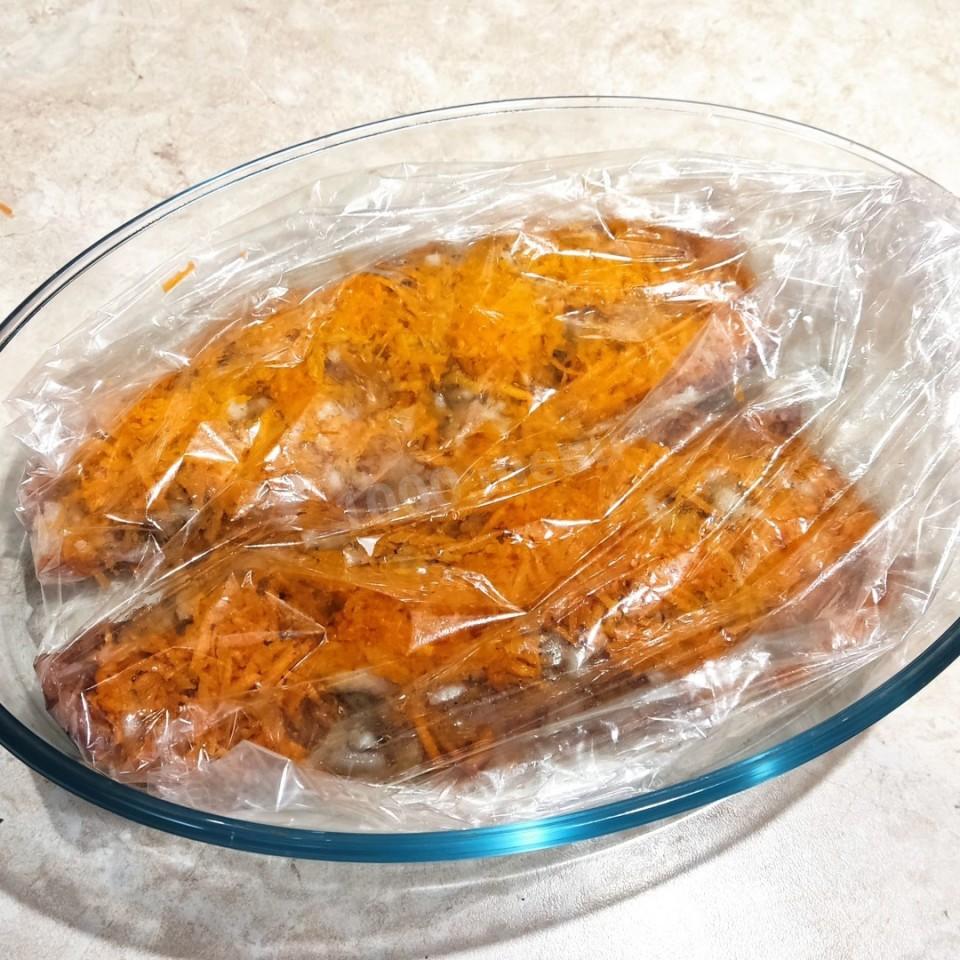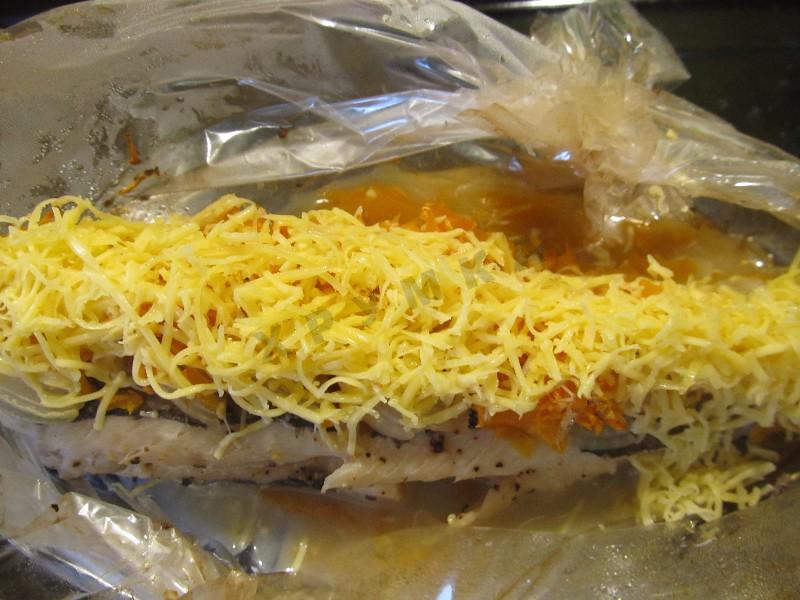 Сверху выложите нарезанный кольцами лук и натертую морковь и отправьте в духовку примерно на 20 минут (200 градусов) Спустя 20 минут пакет разрезать.