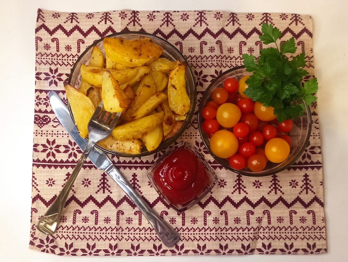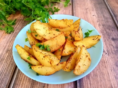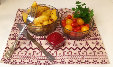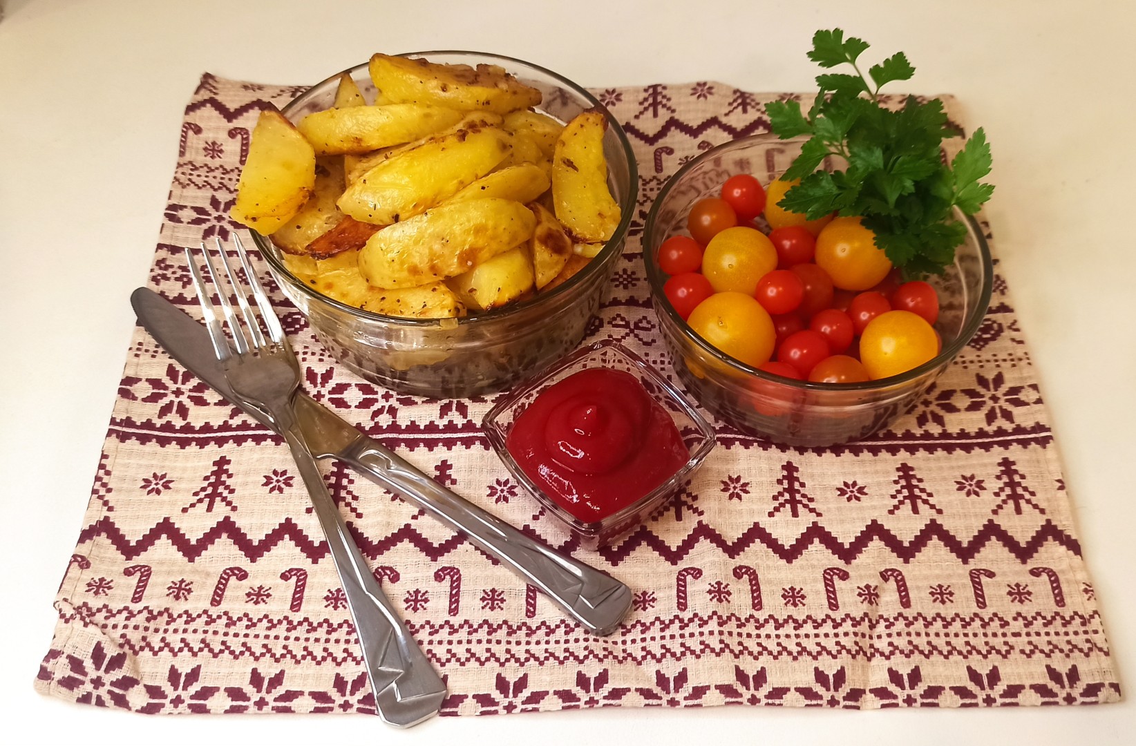 Как же хорошо не выходя из дома покушать картошку по деревенски как в Макдональдсе. А приготовить её совсем не сложно. Мне понадобилось 4-5 картошек среднего размера, которые я разрезала на несколько долек. Картофельные дольки обсушила полотенцем от влаги. Затем смешала со смесью масел и специями. Из приправ взяла ароматные травы и паприку, мне кажется, они больше всего подходят к картошке по деревенски. Запекала 30 минут при 200°. Картошечка стала румяной, очень ароматной, с хрустящей корочкой. На вкус она немного сливочная, пряная, слегка остренькая. Хорошо сочетается с кетчупом, сырным соусом и домашними соленьями.