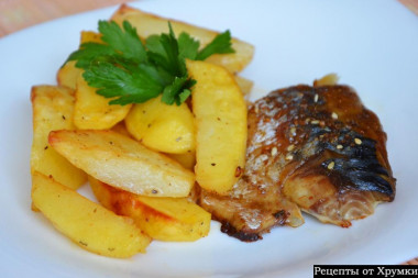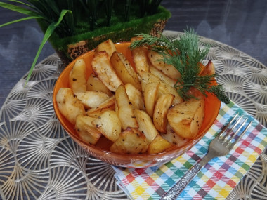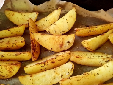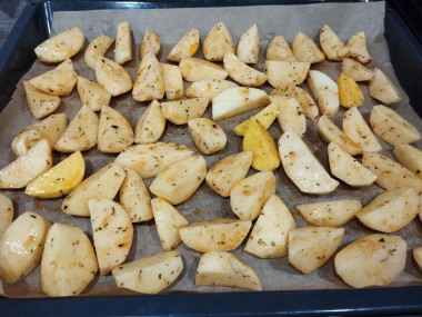 В глубокой чашке соединила дольки картофеля, масло растительное со сливочным и специи. Хорошо перемешала и выложила на противень, застеленный силиконизированным пергаментом. Запекала в духовом шкафу при 180° 40 минут.
