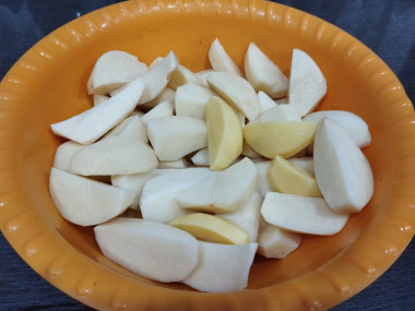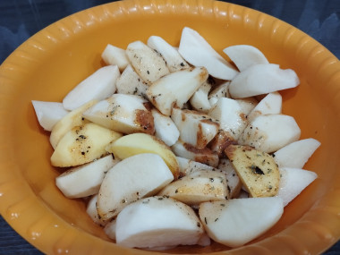 Нарезанный картофель обваляйте в подготовленной масляной заправке. Проследите, чтобы картофель был ею равномерно покрыт со всех сторон.