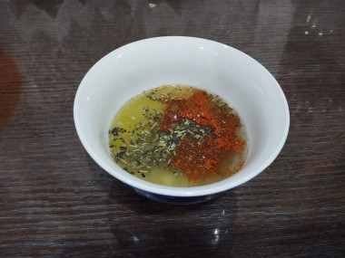 Сливочное масло растопите в микроволновой печи и добавьте к нему растительное масло. По вкусу подсыпьте соль и специи. В качестве специи можно взять молотый перец, хмели-сунели, паприку, сушеные травы... Выбирайте на свой вкус.